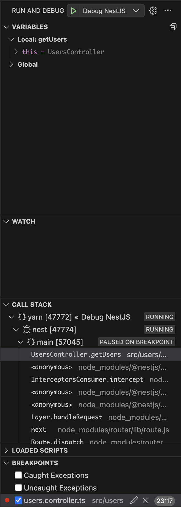 위와 같이 해당 줄에서 멈추며 좌측 디버그창에는 각종 정보들이나 콜스택을 확인할 수 있다.