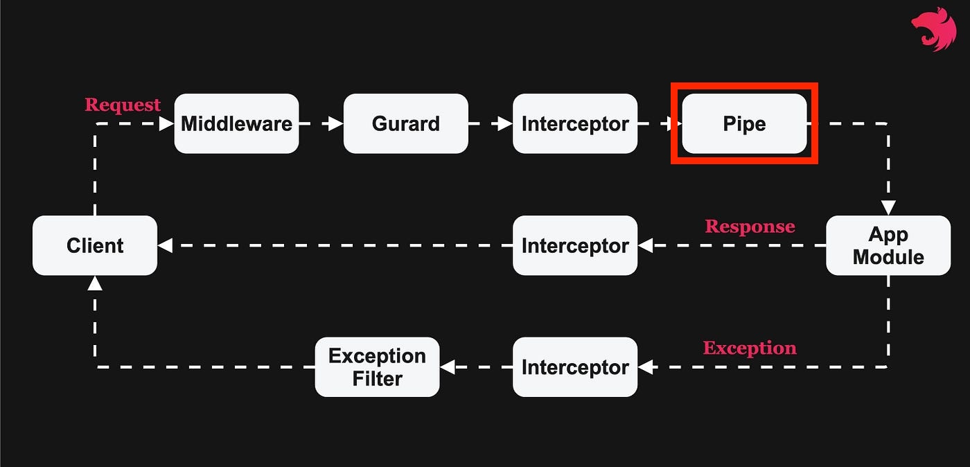 NestJS의 Pipe는 주로 요청 데이터의 변환(Transformation)과 유효성 검증(Validation)을 담당하는 기능이다. Pipe는 컨트롤러에 도달하기 전에 요청 데이터에 대해 전처리 작업을 수행하여, 데이터의 형식을 맞추거나 유효한지 검사한다.