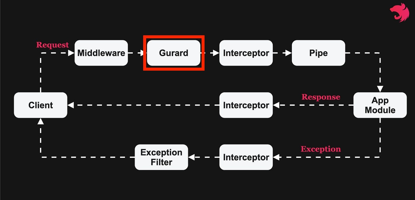 Guard는 요청이 컨트롤러의 핸들러에 도달하기 전에, 인증(Authentication)이나 인가(Authorization) 같은 추가적인 보안 로직을 수행하는 데 사용된다. Guard는 특정 조건이 충족되지 않으면 요청 처리를 중단하고, 그에 따른 예외를 던져 클라이언트에게 접근을 거부할 수 있다.