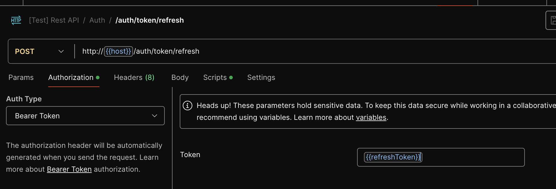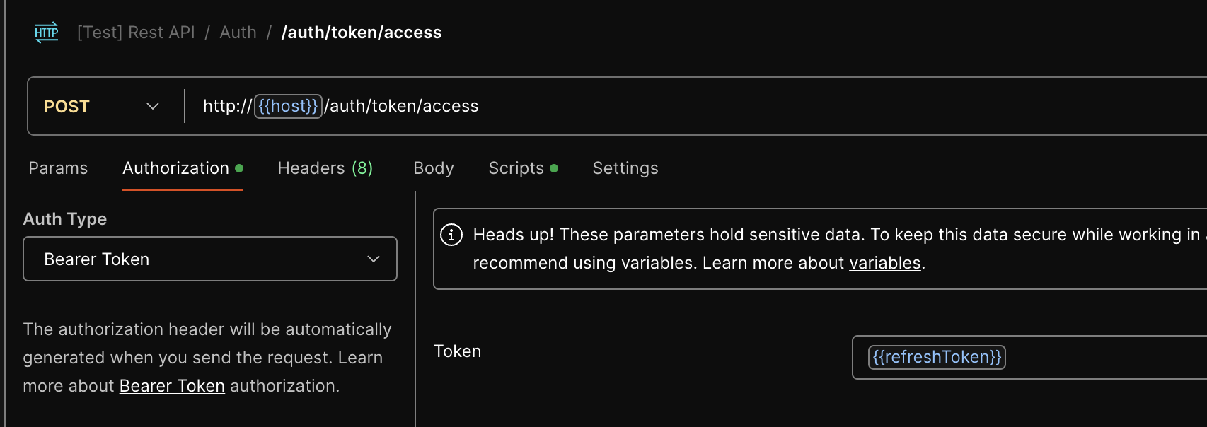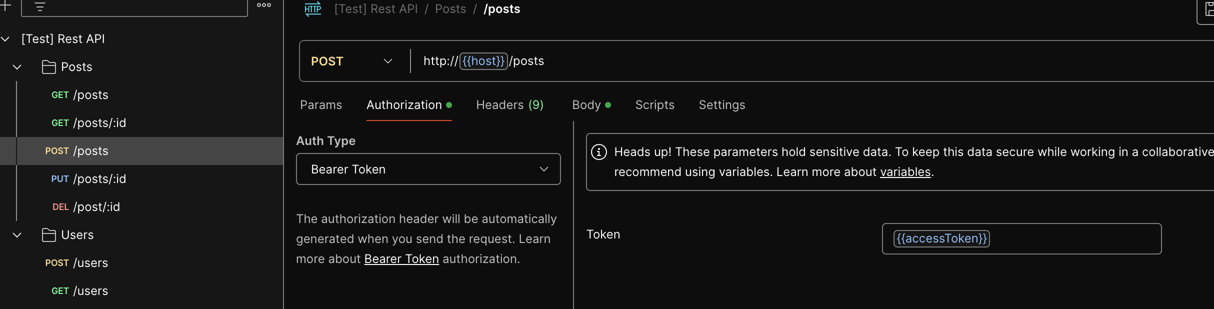 Post를 생성하는 API에 Authorization 탭에 Auth Type을 Bearer Token을 선택하면 Token을 입력하도록 되어있는데, Post 생성 시에는 AccessToken을 검증해야하기 때문에 AccessToken을 환경변수에서 가져오도록 설정하면 된다.