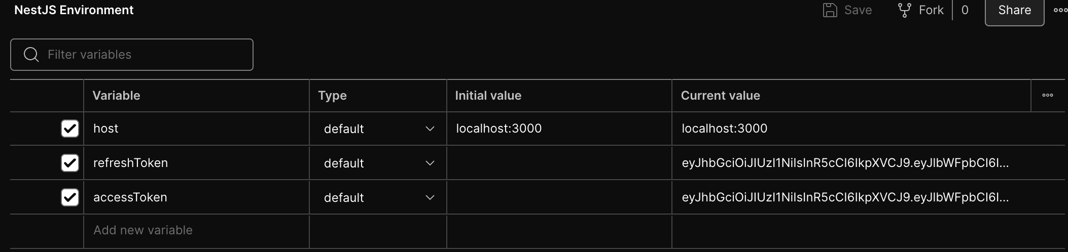 잘 실행되어 AccessToken과 RefreshToken일 발급되면 이것이 Postman의 Environments의 환경변수로 잘 들어가있는 것을 볼 수 있다.