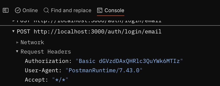 아래 콘솔창을 확인해보면 Request Headers에 Authorization을 'Basic [토큰]'으로 보내주는 것을 알 수 있다.