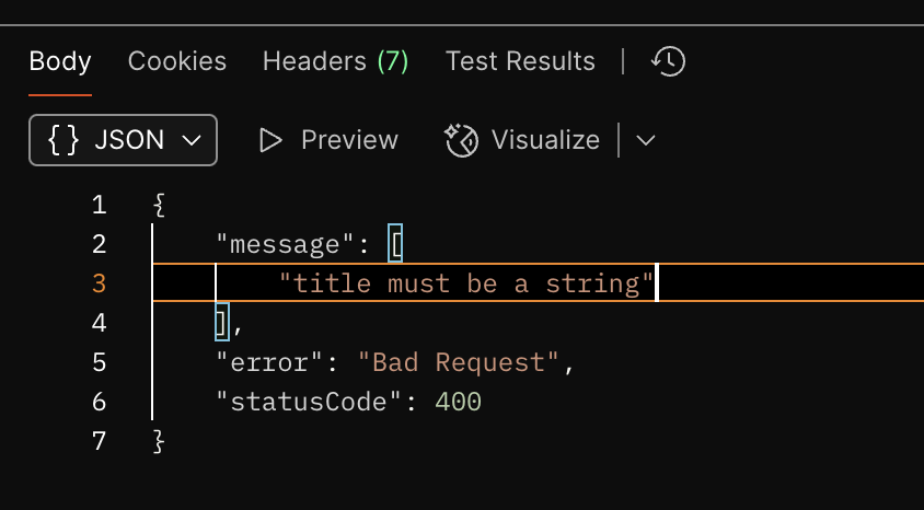그리고 Postman에서 서버로 Send하면 위와 같이 검증되는 것을 알 수 있다. 위의 상황은 title이 string이 아닐 경우이다.
