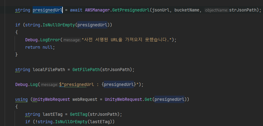 public static async UniTask<string> GetPresignedUrl(string apiUrl, string bucketName, string objectName)