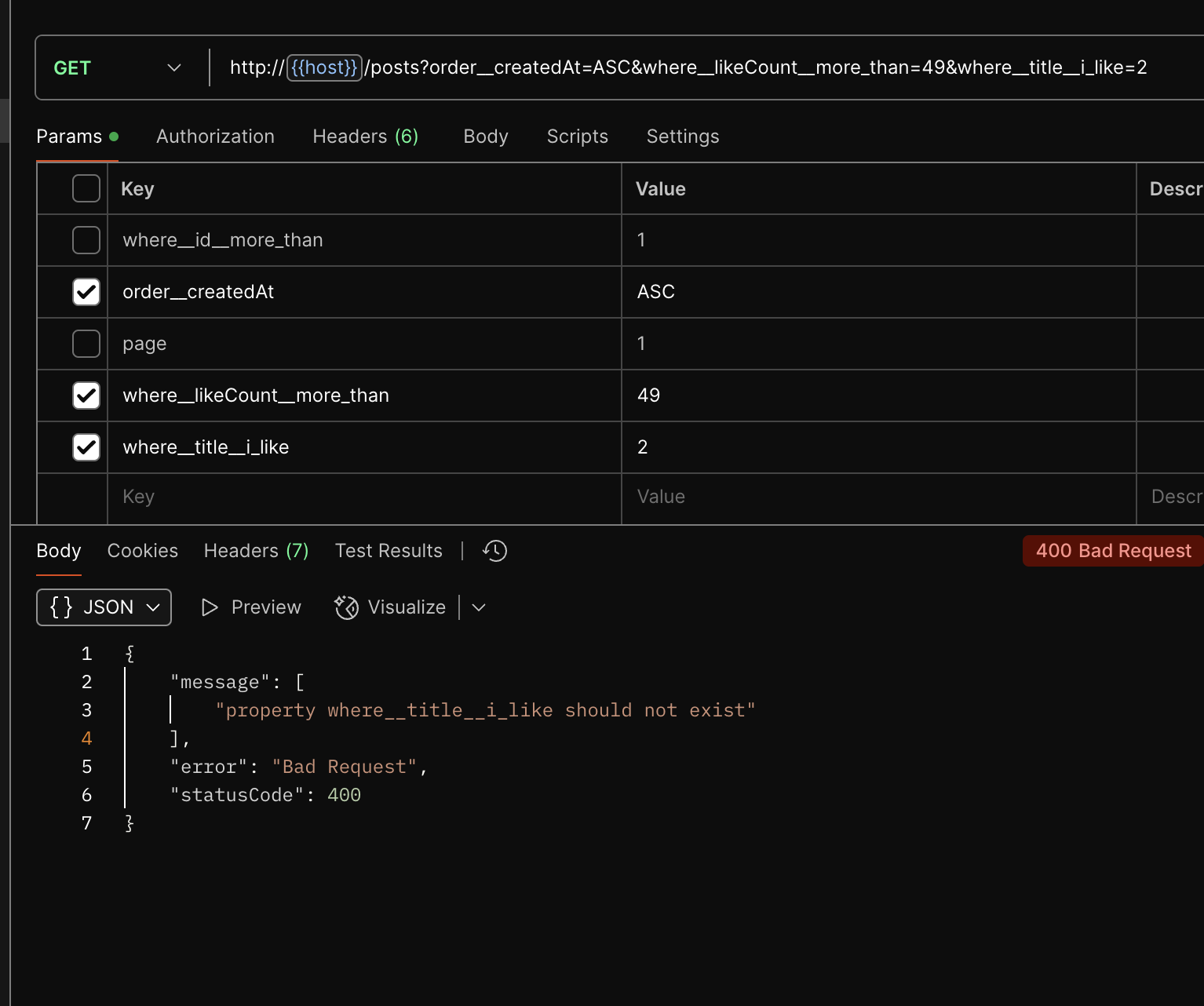 그리고 다시 포스트맨을 실행하면 이전과는 다르게 where__title__i_like를 쿼리에 담아 서버로 보내도 서버에서 실행되지 않는 것을 알 수 있다.