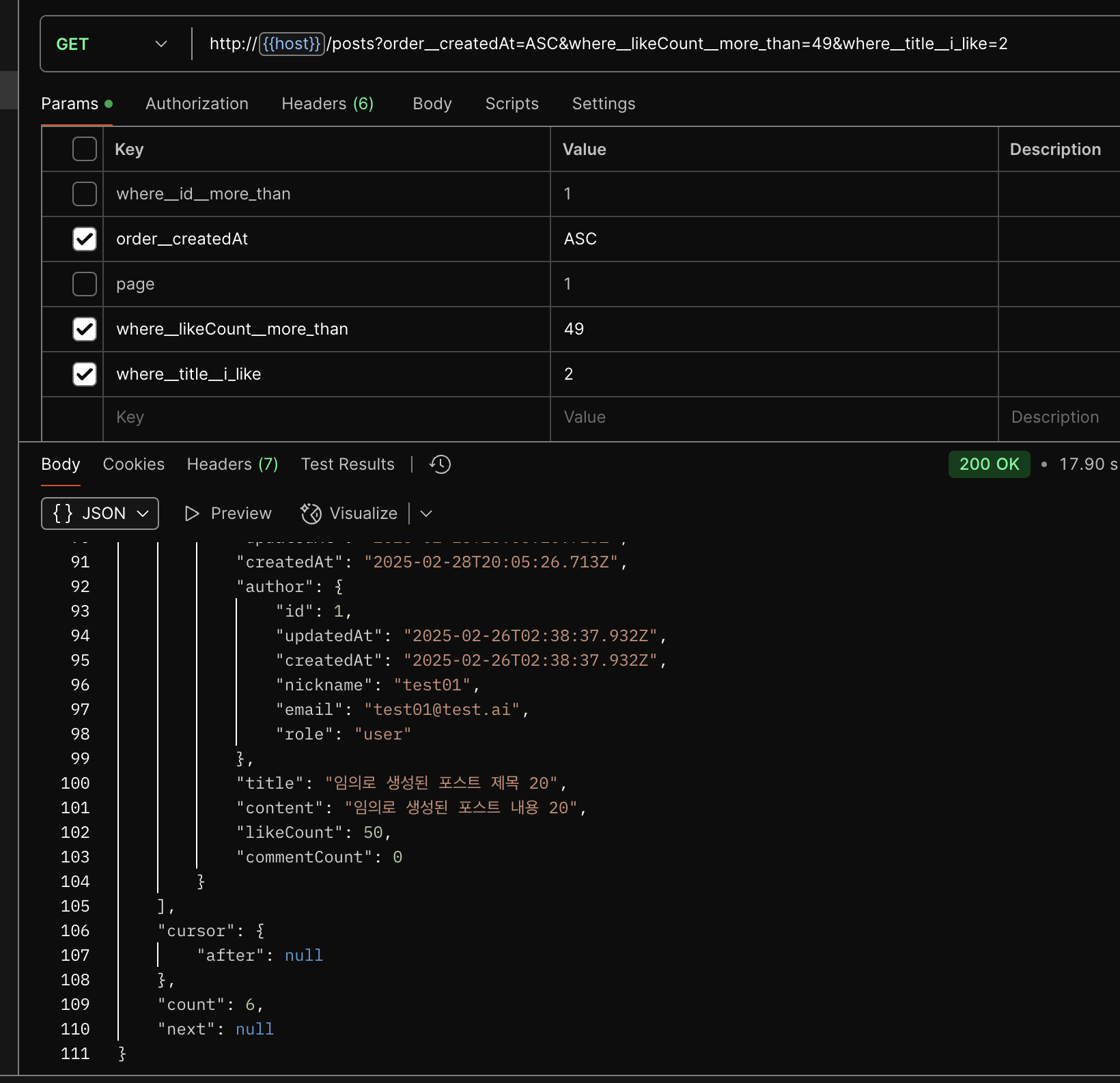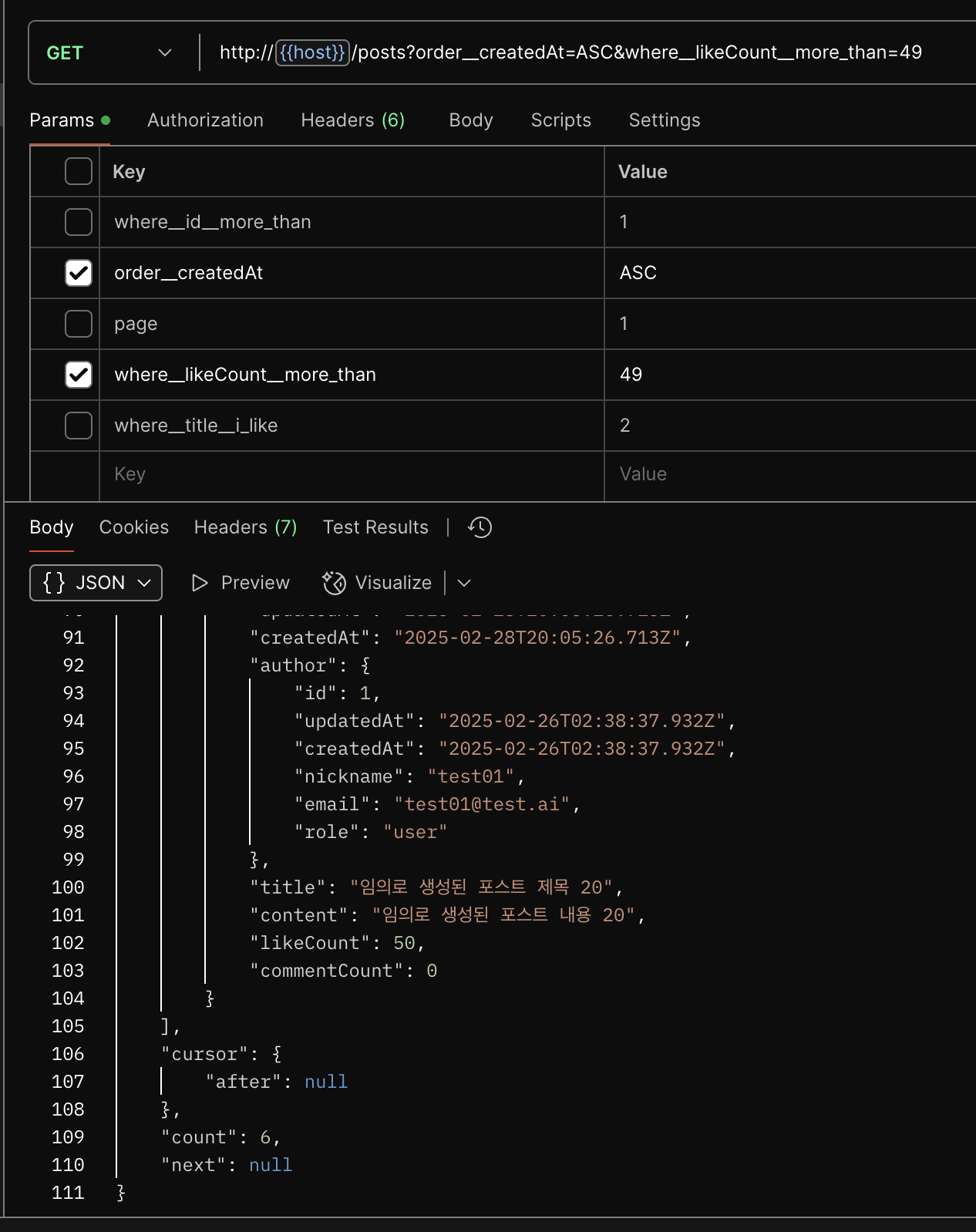 where__likeCount__more_than 만 쿼리로 보낼 때, 포스트 개수가 6개인 것을 알 수 있다.