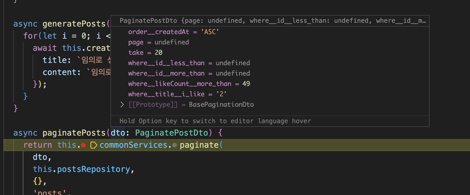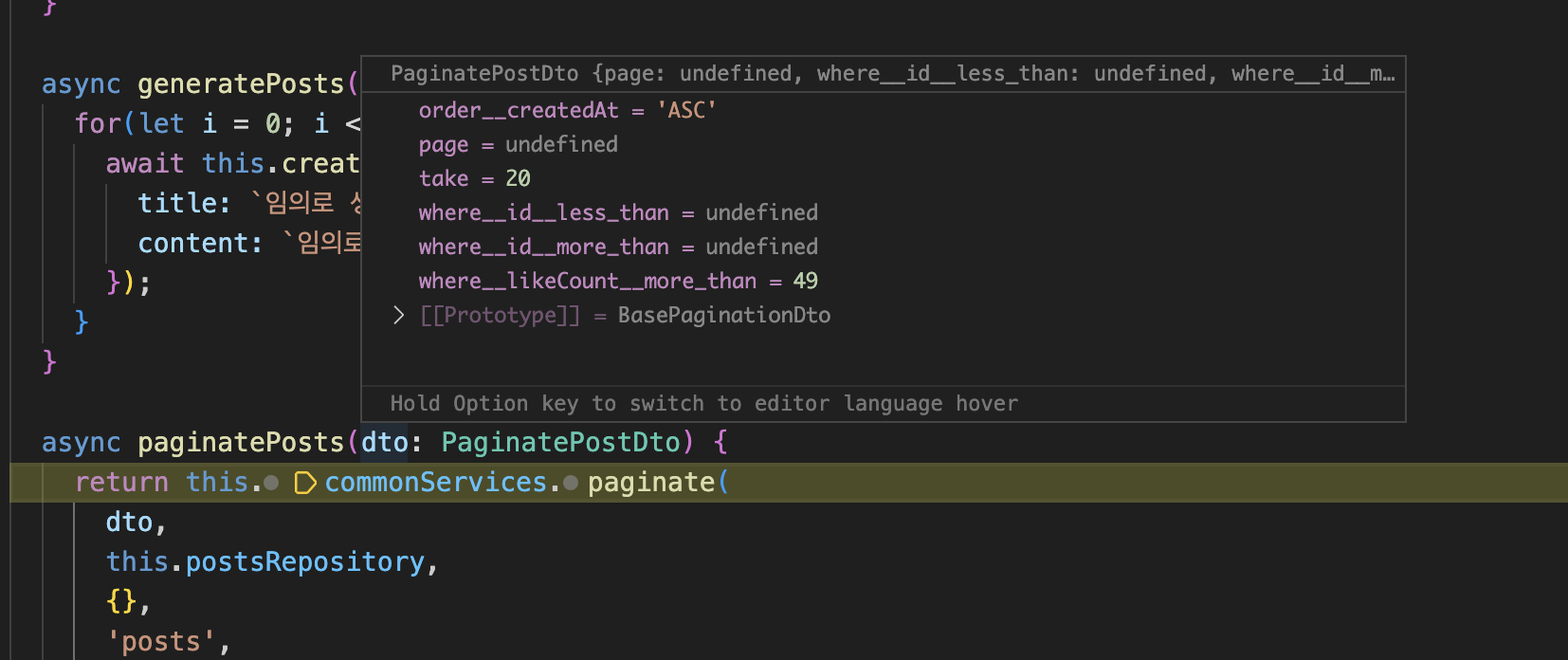 해당 코드는 PaginatePostDto에 있던 프로퍼티들을 그대로 옮긴 것이다.
