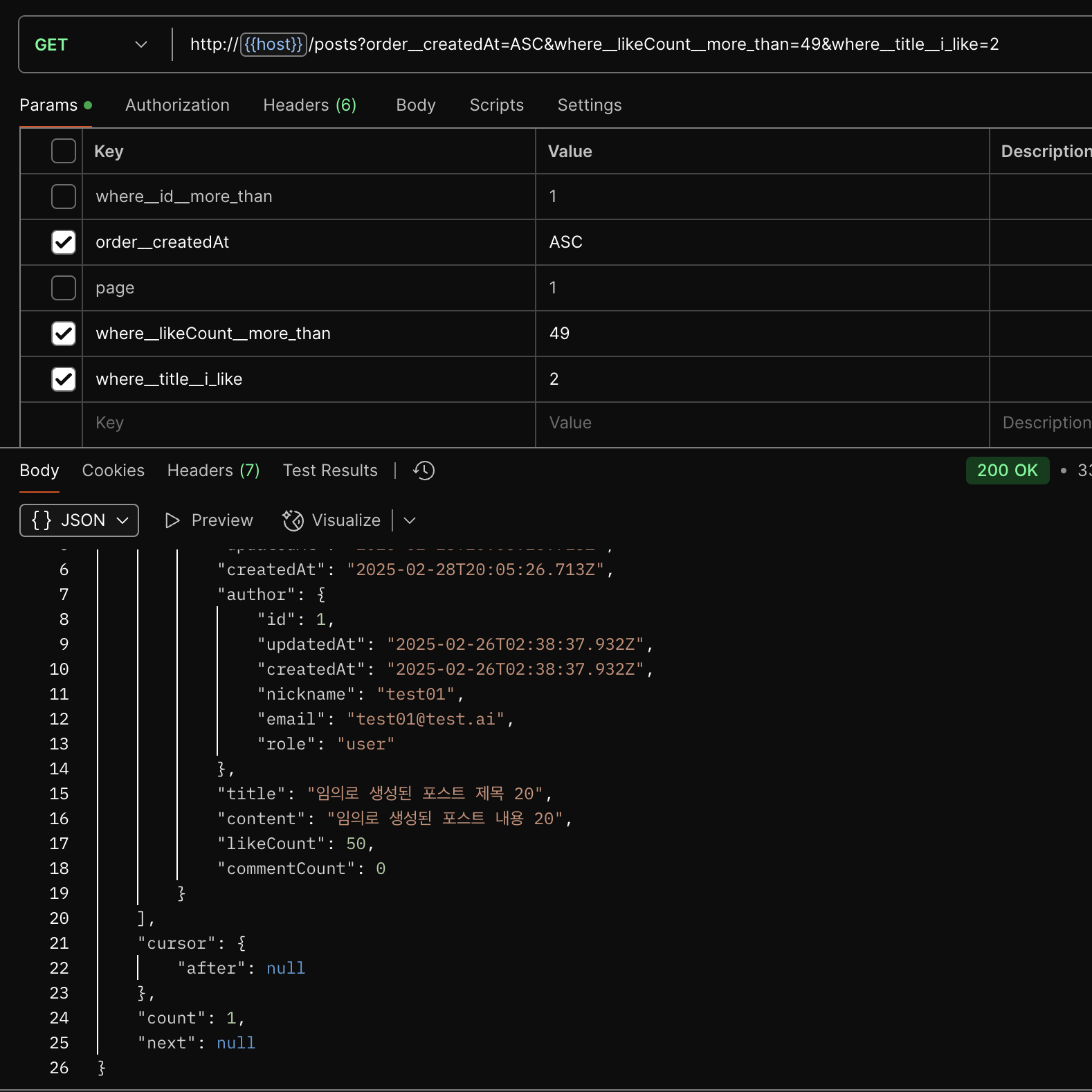 서버에서 where__title__i_like 프로퍼티를 비활성화했는데도 불구하고, 클라이언트측에서 where__title__i_like 를 담아보내면 서버에서 실행되는 것을 볼 수 있다. (포스트 개수가 1개)