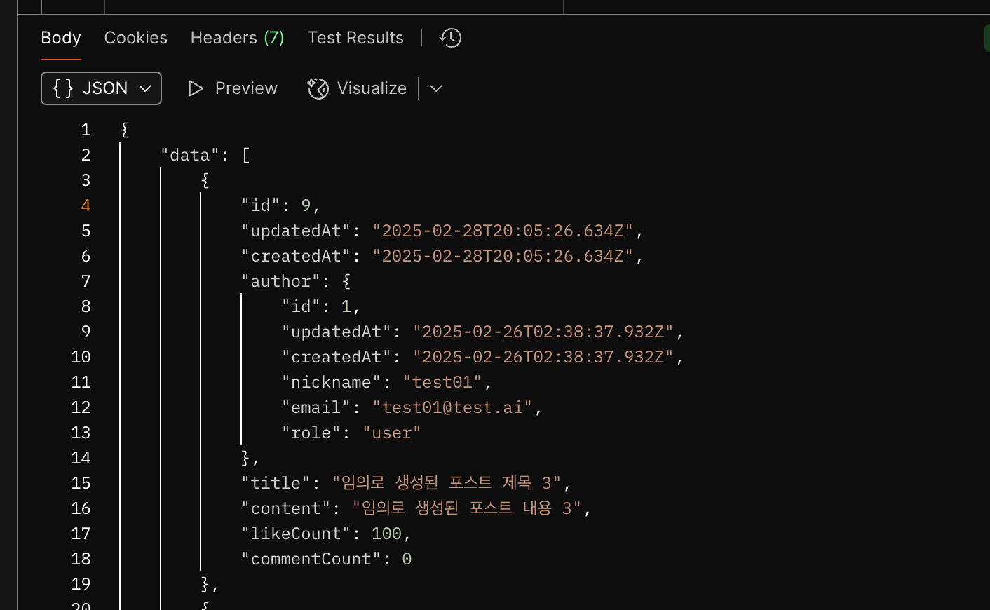 commonServices.paginate의 두 번째 파라미터는 overrideFindOptions: FindManyOptions<T> = {}, 로 다양한 옵션을 설정할 수 있도록 한다. 위와 같이 relations: ['author']를 하게 되면 포스트에 author 의 정보가 보이게 된다.