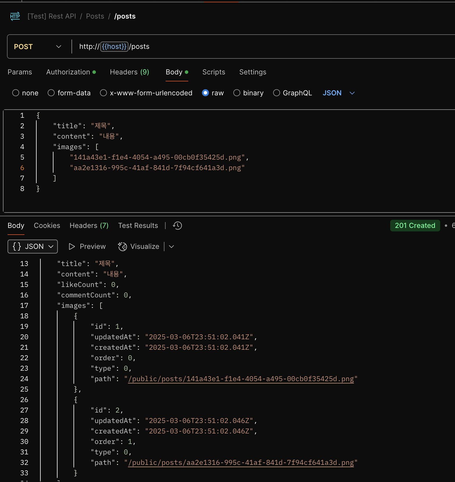 postPosts에선 여러 개의 이미지를 받을 수 있으므로, for loop을 통해 createPostImage를 실행하도록 한다.