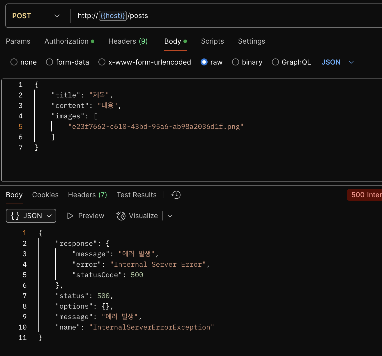 중간에 throw new InternalServerErrorException('에러 발생'); 를 넣어 트랜잭션이 잘 되는지 테스트해보자.
