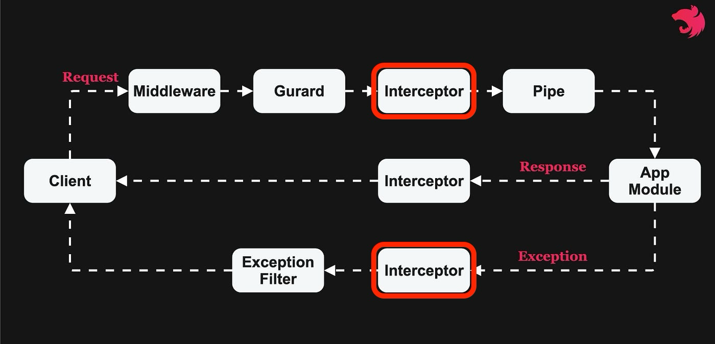 클라이언트에서 서버로 요청 -> next.handle().pipe() 이전 intercept 내의 로직들 -> 컨트롤러 메서드 실행 -> next.handle().pipe() 내부로직 실행 -> 서버에서 클라이언트로 응답