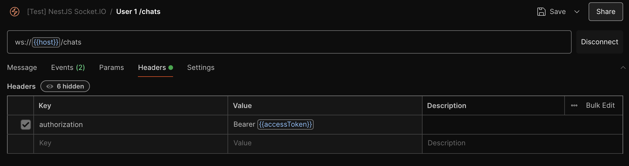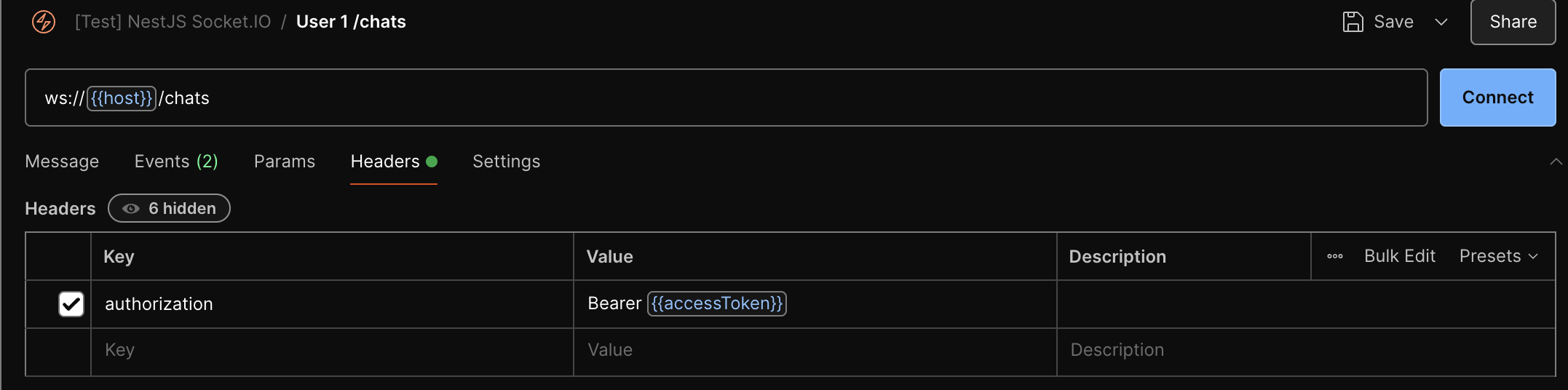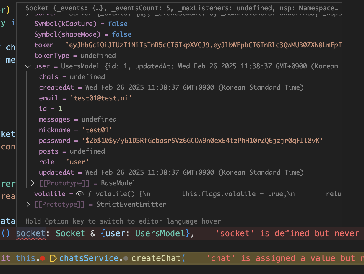또한 Guard를 통해 SocketBearerTokenGuard 가 실행되며 socket.user에 UsersModel을 넣었으므로, socket에는 user가 있다는 것을 알 수 있다.
