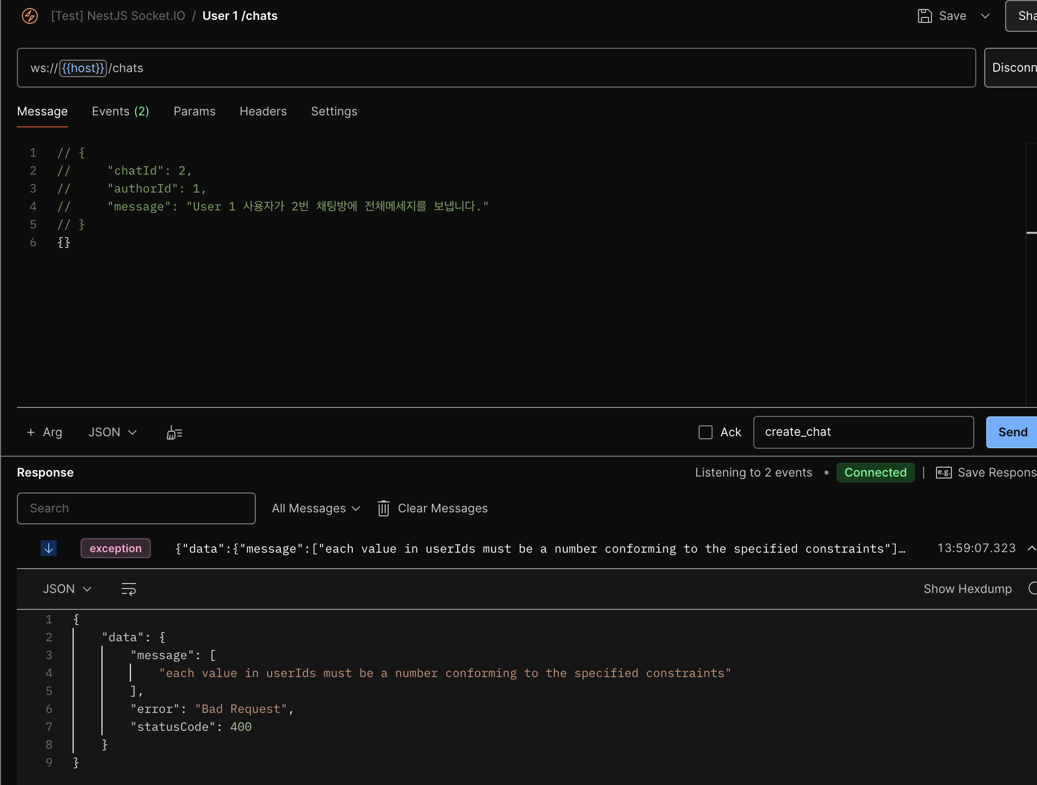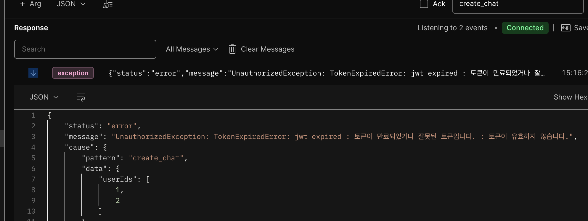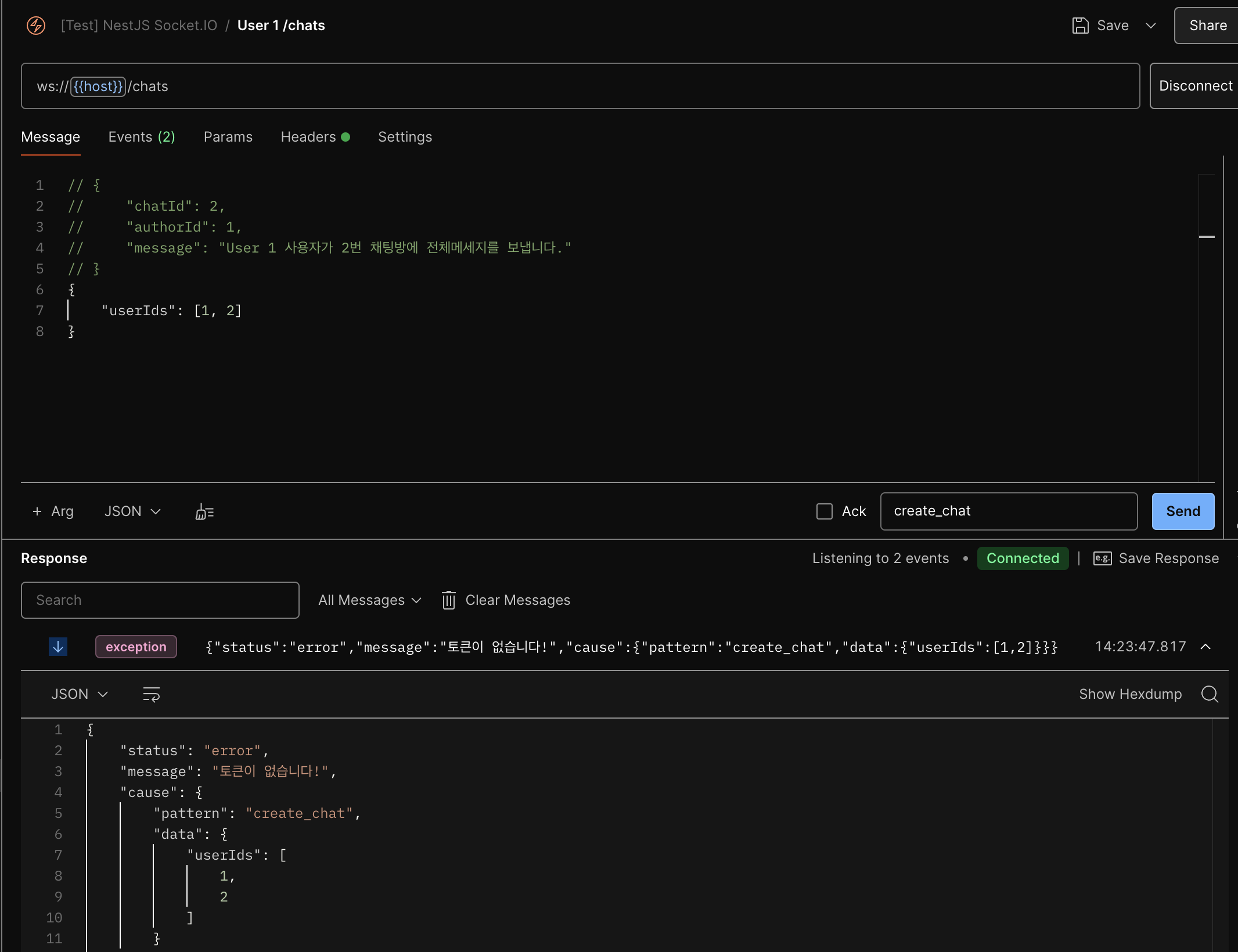 구현한 Exception Filter를 ChatsGateway 클래스에 적용하면 해당 클래스내의 모든 통신에 Exception Filter를 적용할 수 있다.
