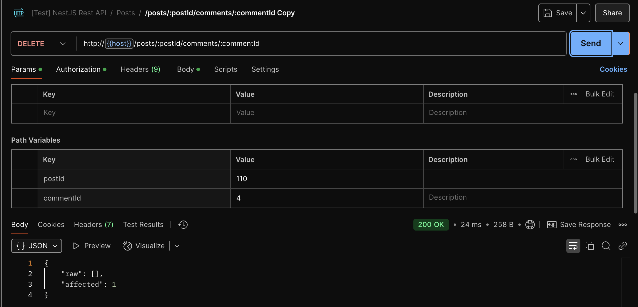 @Delete(':commentId')