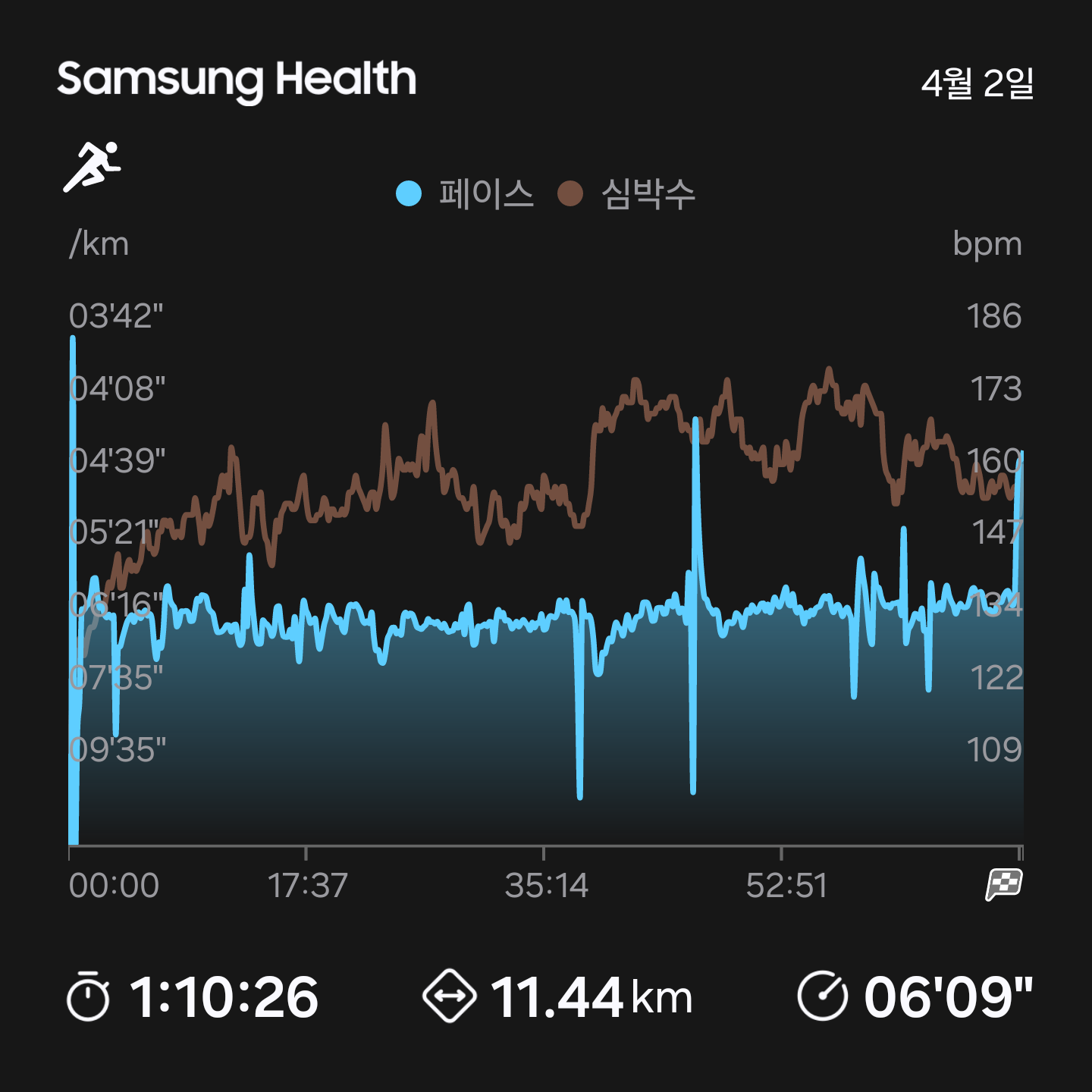 심박수를 신경쓰지 않는다하더라도 너무 높은 것 같은데, 추후에는 좀 더 저강도로 달려서 유산소 운동이 되도록 노력해봐야겠다.