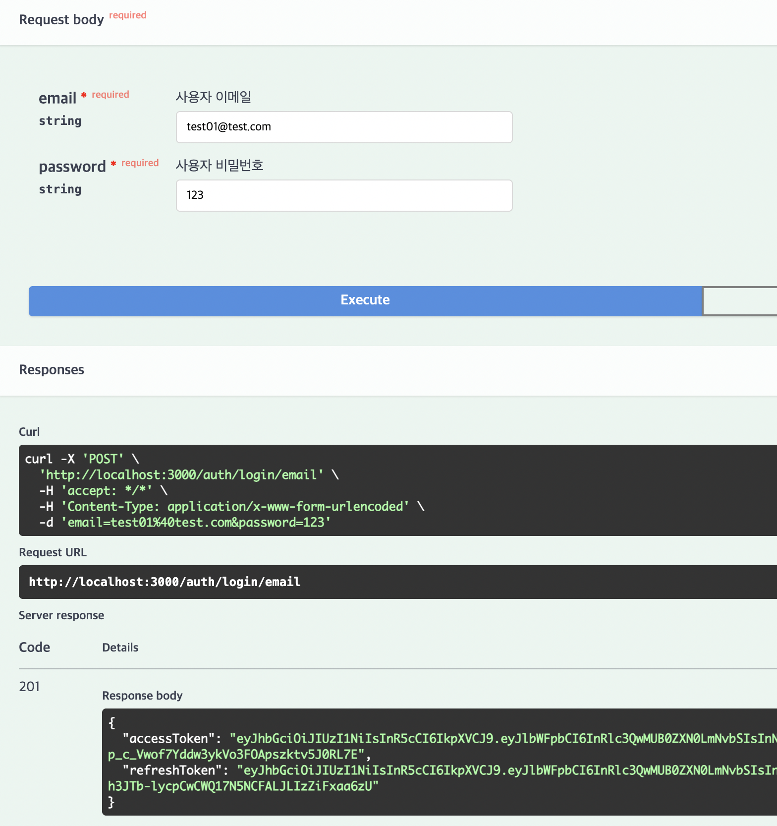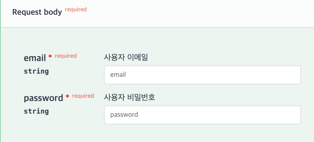 @ApiBody는 body에 어떤 값이 들어갈지를 명시한다. LoginDto를 입력하였으므로 위와 같이 form의 형태로 email, password를 입력할 수 있는 란이 나타난다.