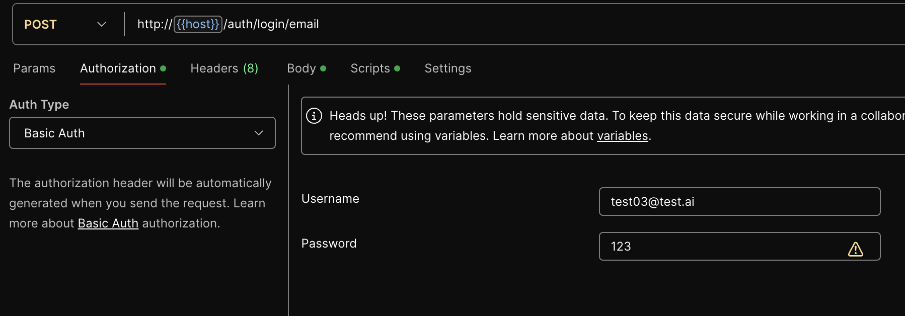 Postman에선 Authorization 탭에서 Auth Type과 Username, Password를 통해서 로그인(AccessToken, RefreshToken 발급)이 가능하도록 구현했다.
