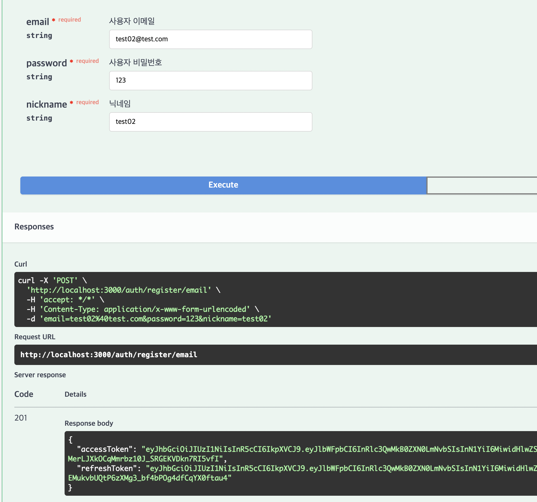 회원가입 시 AccessToken과 RefreshToken을 발급하며, DB에도 유저가 생성되는 것을 볼 수 있다.