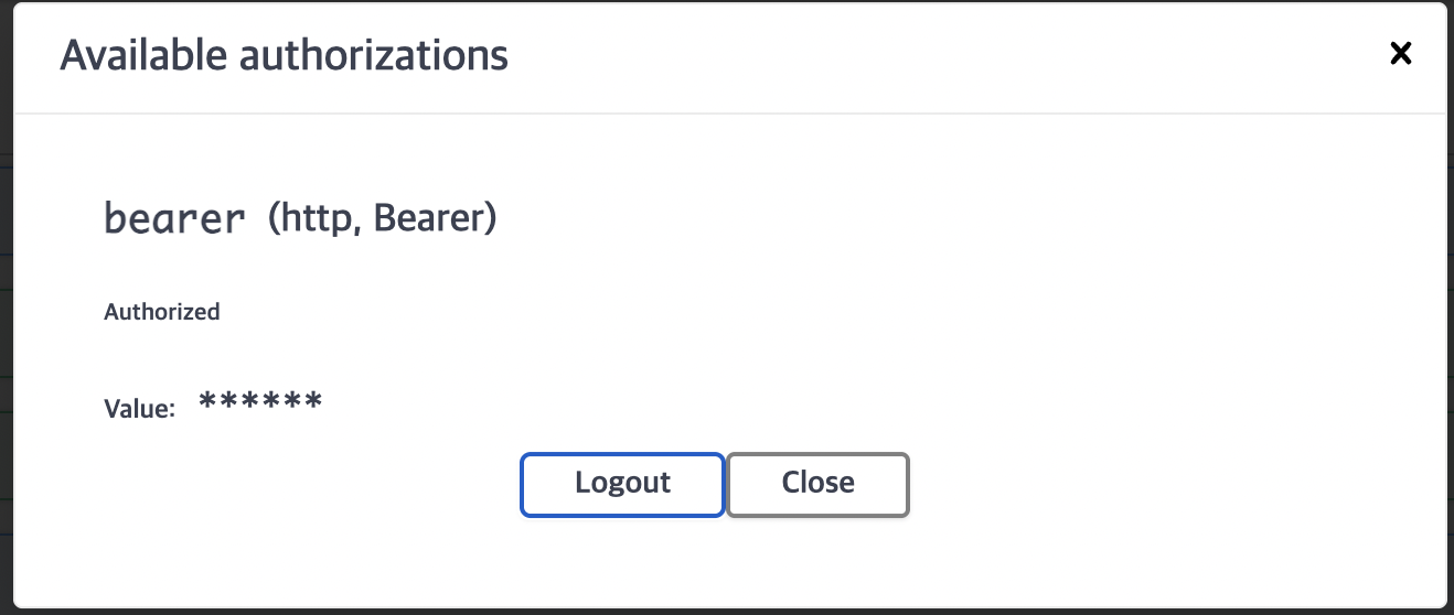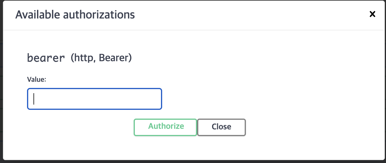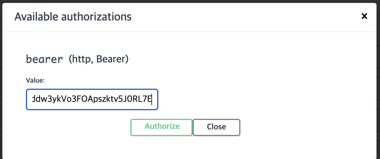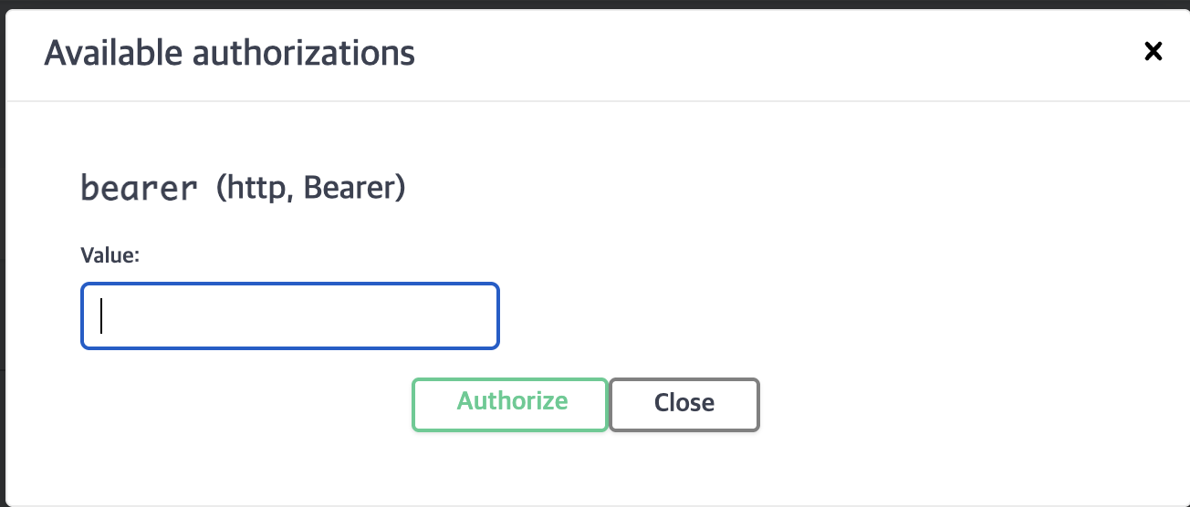 Swagger 오른쪽 상단에 Authorize 버튼이 나타나며, 이것을 누르면 AccessToken을 입력하는 팝업이 나타난다.