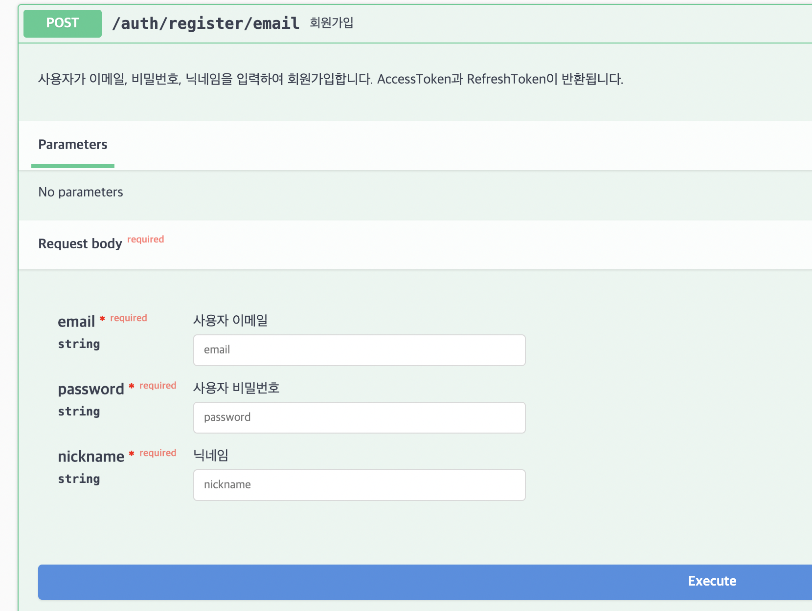 description: '사용자가 이메일, 비밀번호, 닉네임을 입력하여 회원가입합니다. AccessToken과 RefreshToken이 반환됩니다.'