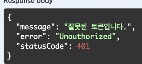 만약 그냥 엔드포인트를 실행하면 Response는 위와 같이 잘못된 토큰이라는 Error를 발생한다. (잘못된 토큰입니다는 개인적으로 구현한 BearerGuard에 의해 실행)