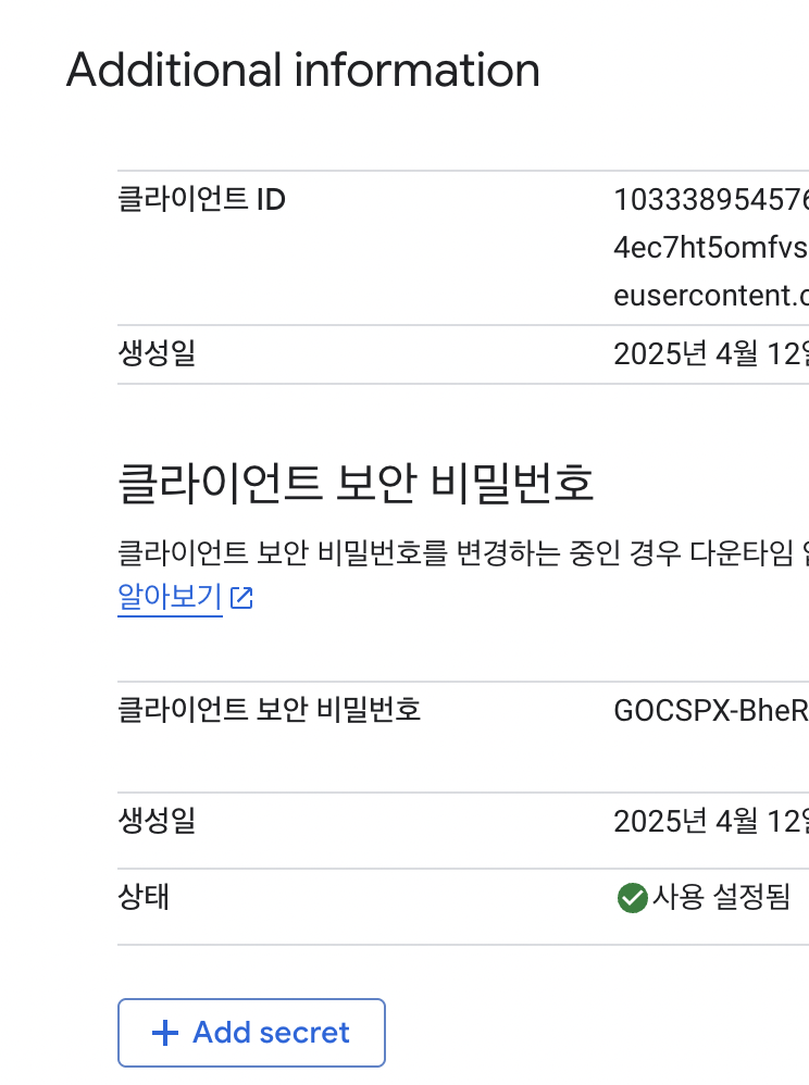해당 OAuth 를 눌러보면 클라이언트 ID, 클라이언트 보안 비밀번호 등이 있다.