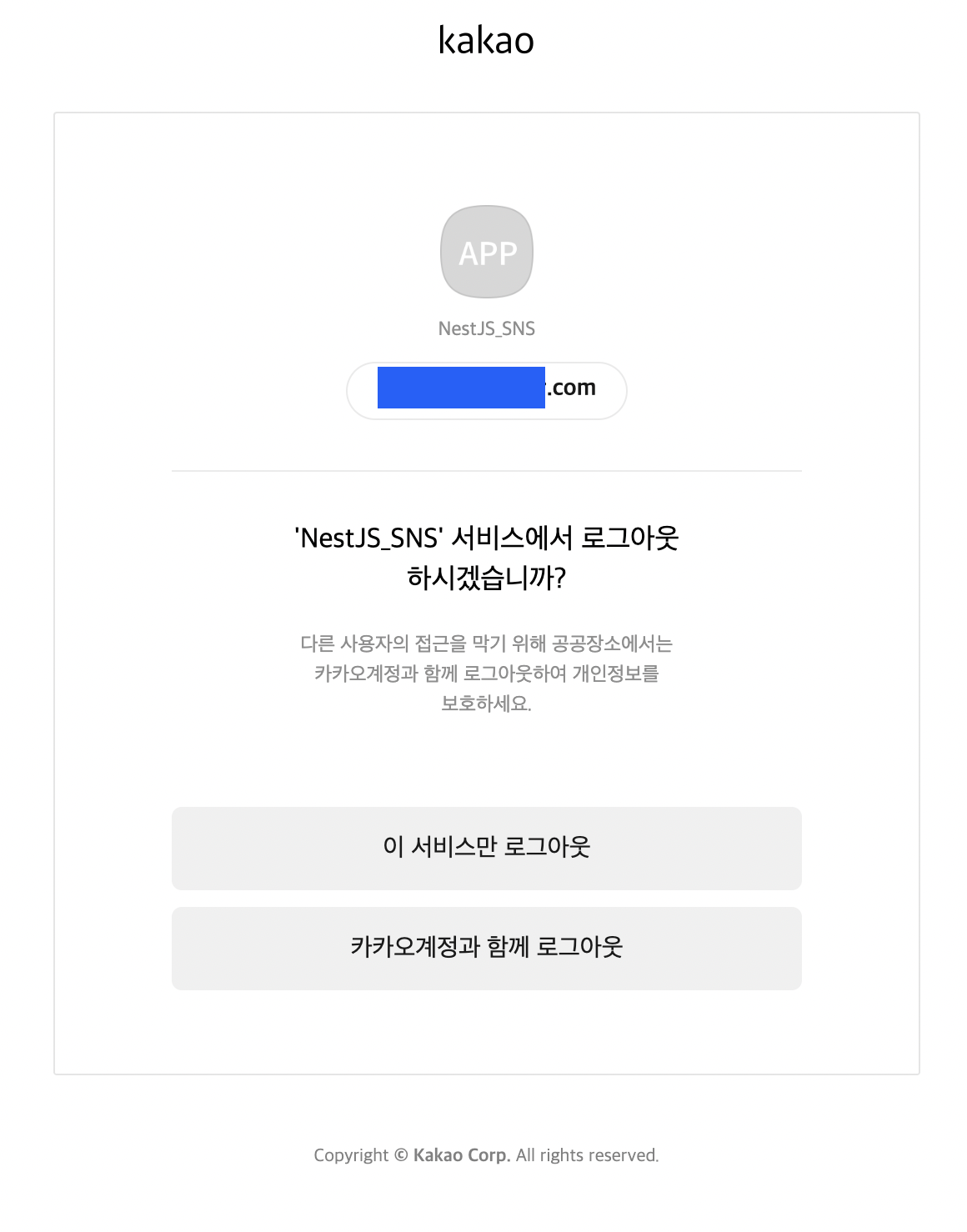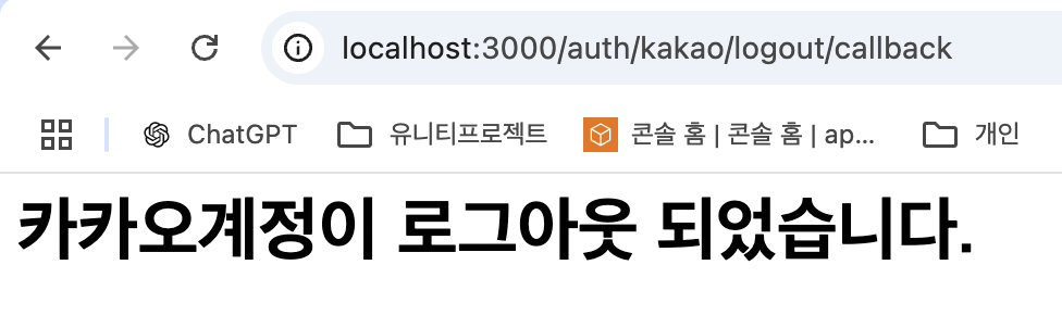 http://localhost:3000/auth/logout/kakao 를 브라우저에 입력하면 위와 같이 로그아웃 화면이 뜬다.