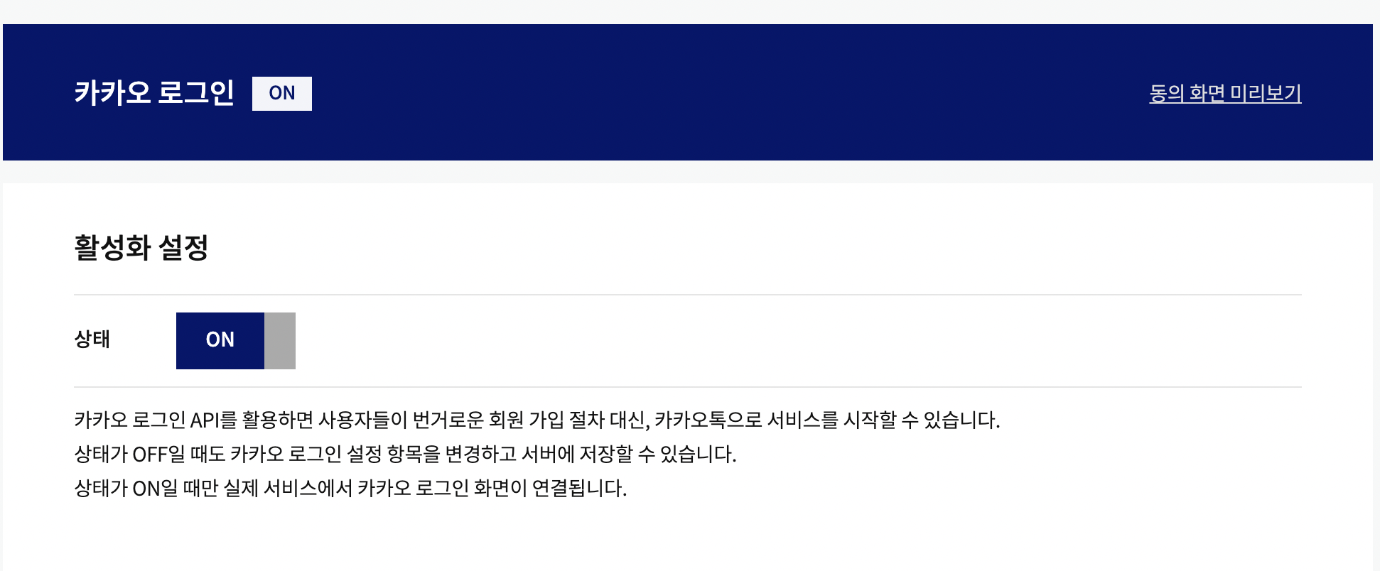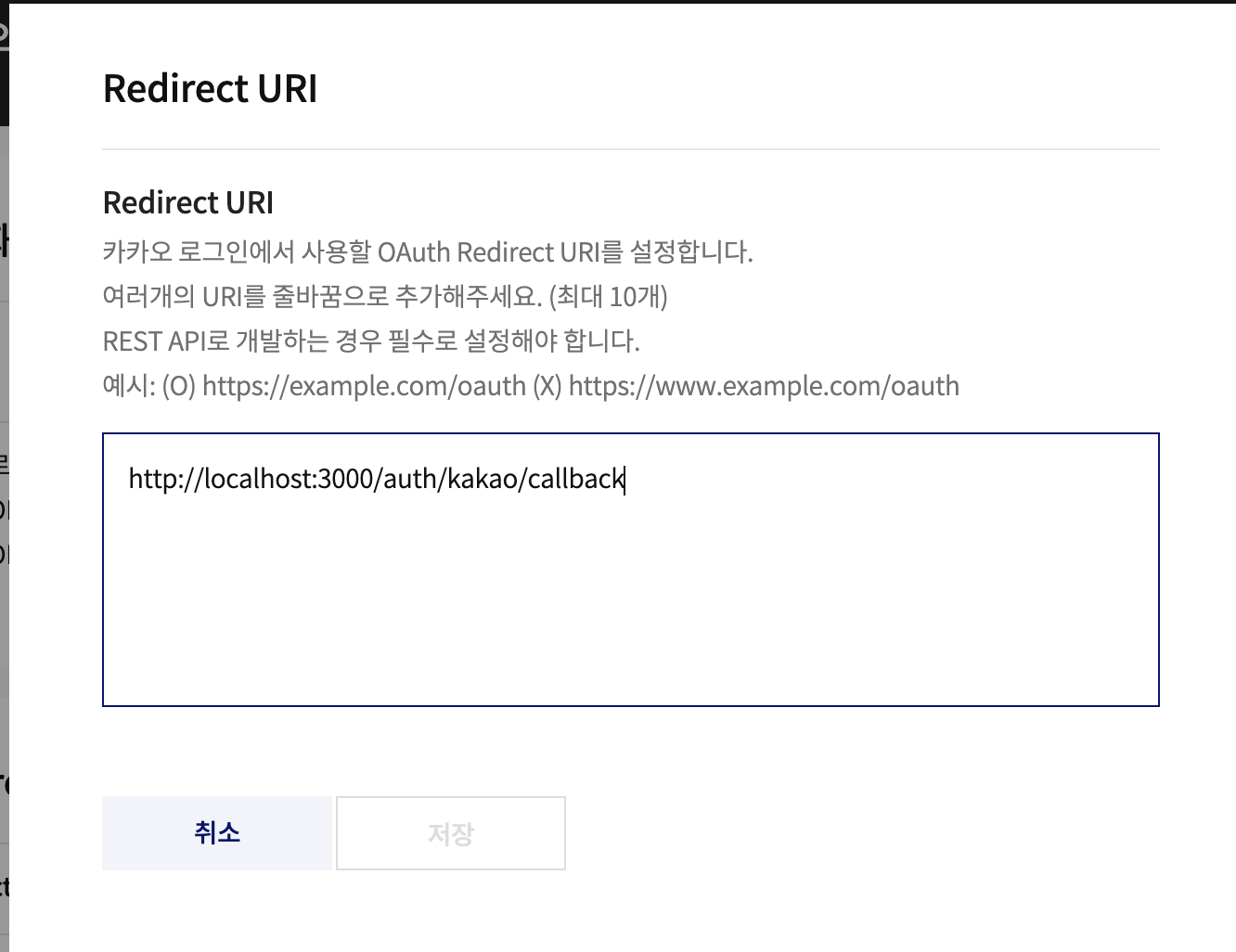 구글 OAuth2.0 설정과 마찬가지로 카카오도 Redirection URI를 설정해주어야 한다. 로그인 성공 후 해당 URI로 리다이렉션 된다.