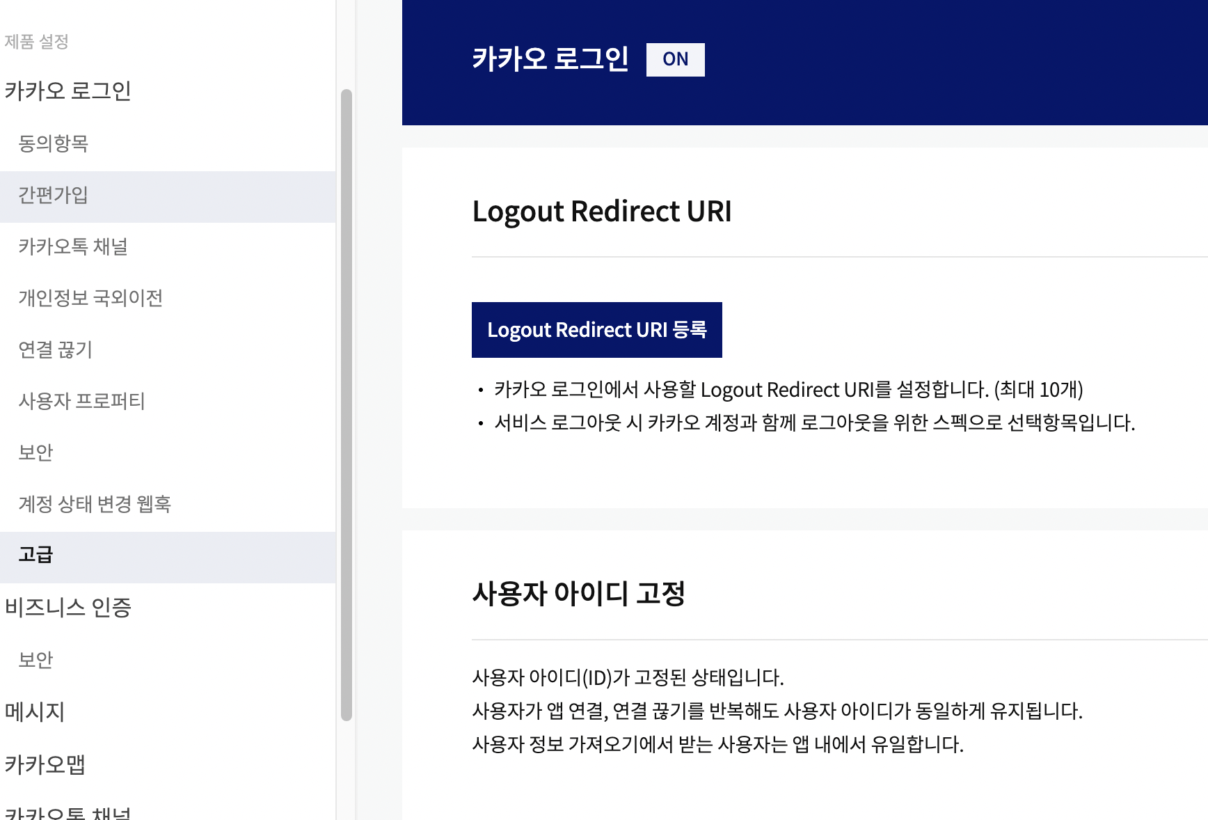 카카오 로그인 - 고급 항목에 Logout Redirect URI 등록을 선택한다.