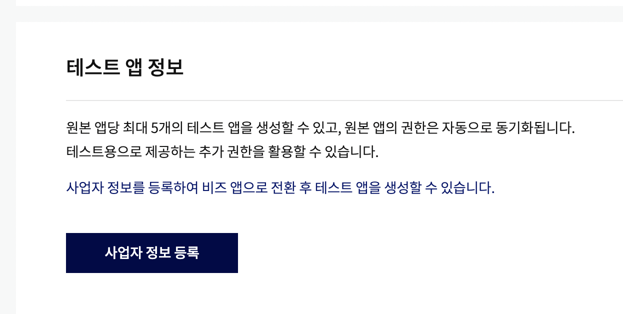 테스트앱을 생성하여 테스트를 할 수 있으나 사업자가 필요하므로, 개인적인 테스트를 위한 사람들은 그냥 넘어가도록 하자.