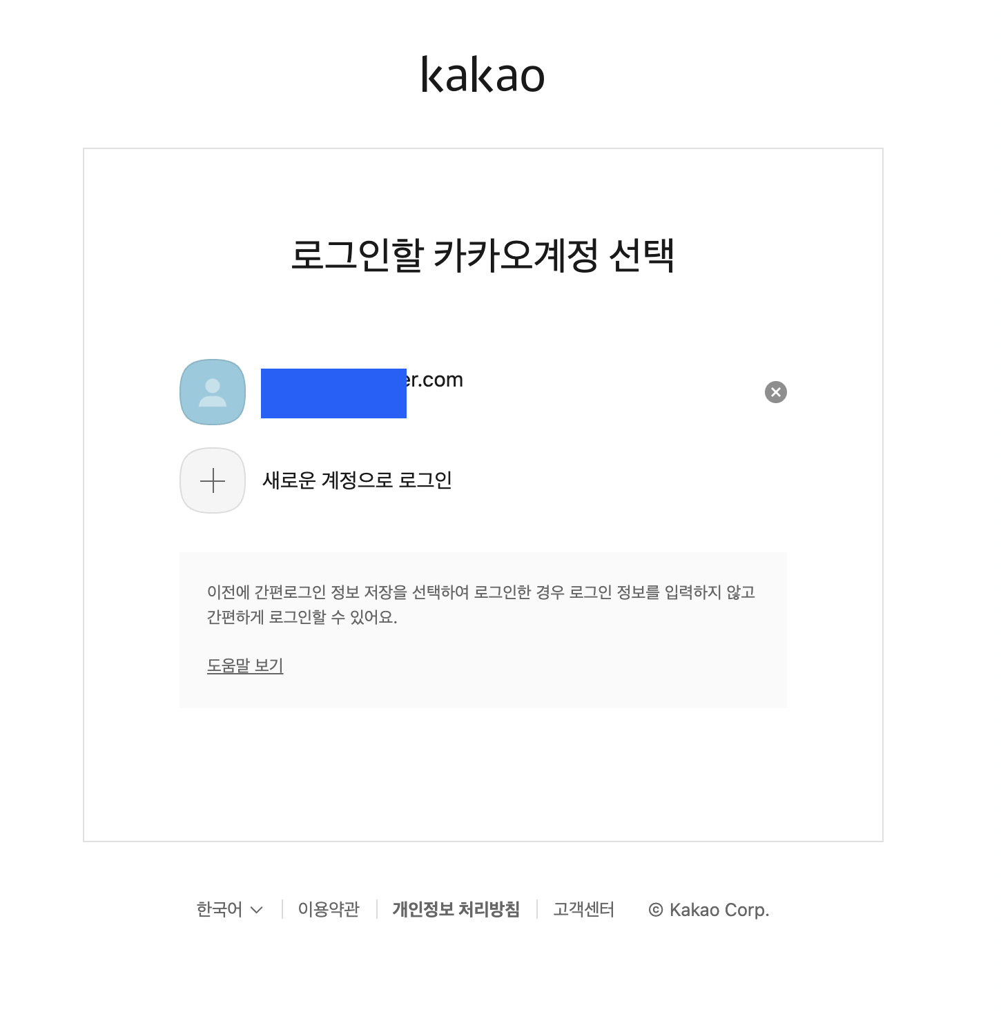 이후 다시 http://localhost:3000/auth/login/kakao 를 입력하면 기존에는 바로 로그인이 되어 accessToken과 refreshToken 발급화면이 보여졌지만, 이젠 처음부터 계정을 선택하도록 되었으며 로그아웃이 잘 적용된 것을 볼 수 있다.