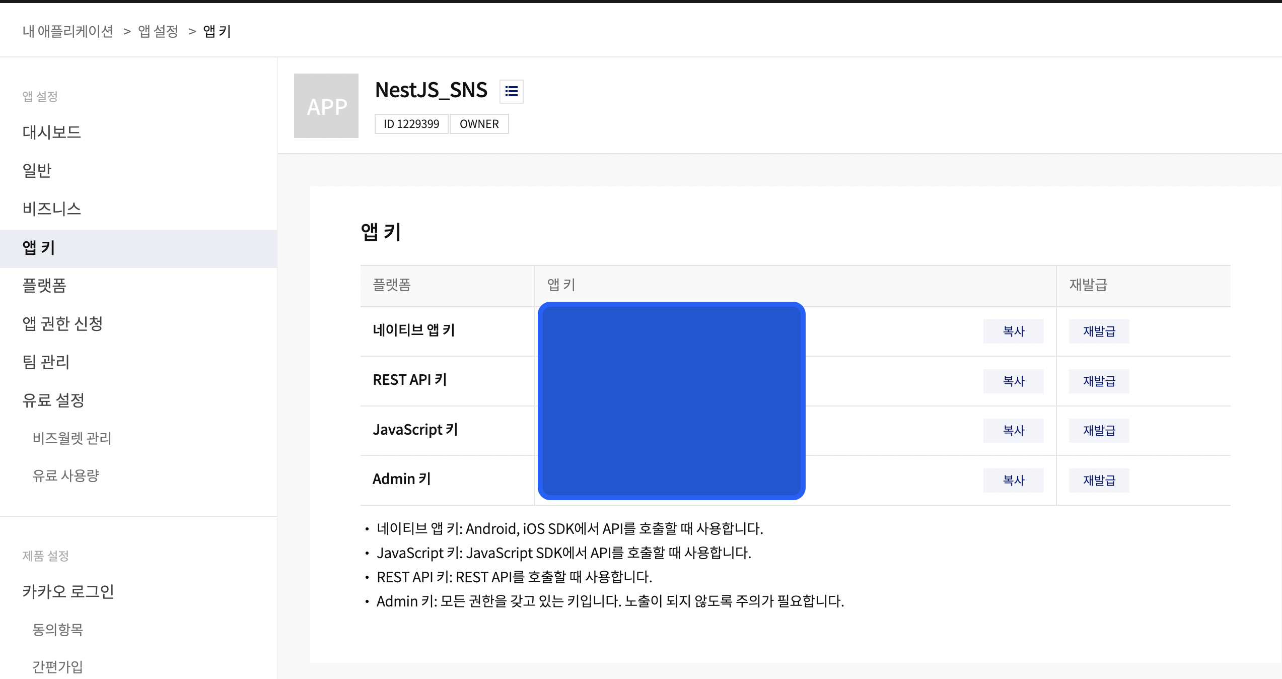 생성하면 앱 키 에서 각종 키들을 사용할 수 있게 된다.