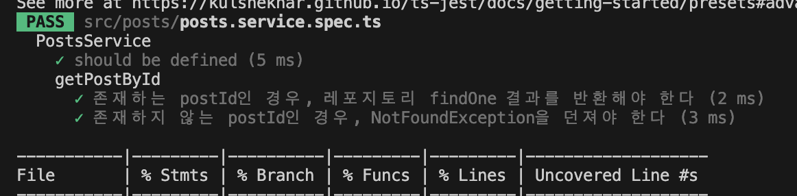 예를 들어, PostsService.getPostById()라는 메서드를 테스트한다고 가정하면,