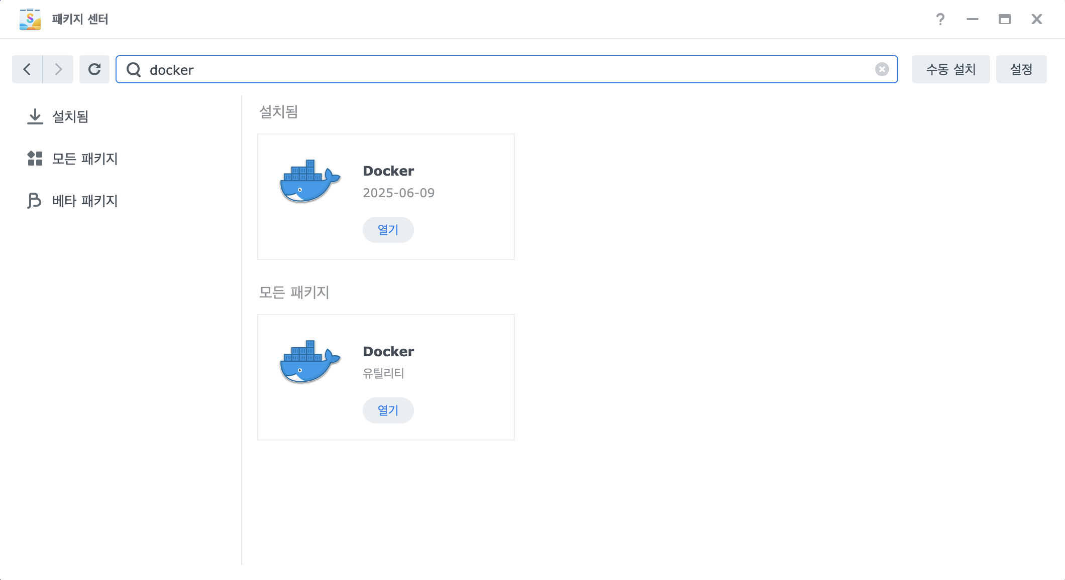 패키지 센터에서 docker를 검색 후 설치하여 실행한다.