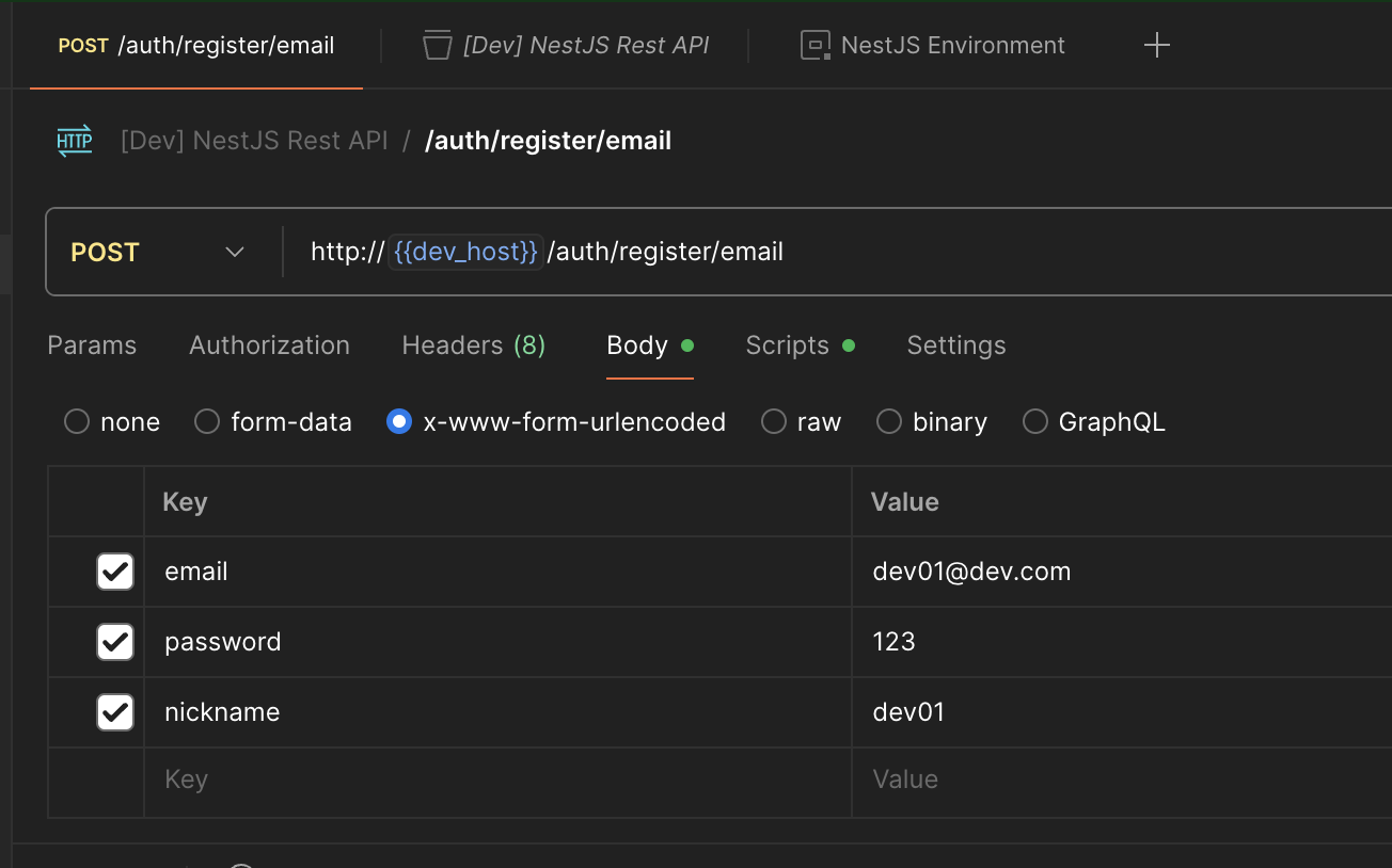 당연히 개발 DB는 비어있으므로, 회원가입하는 API 엔드포인트를 만들어야 한다.