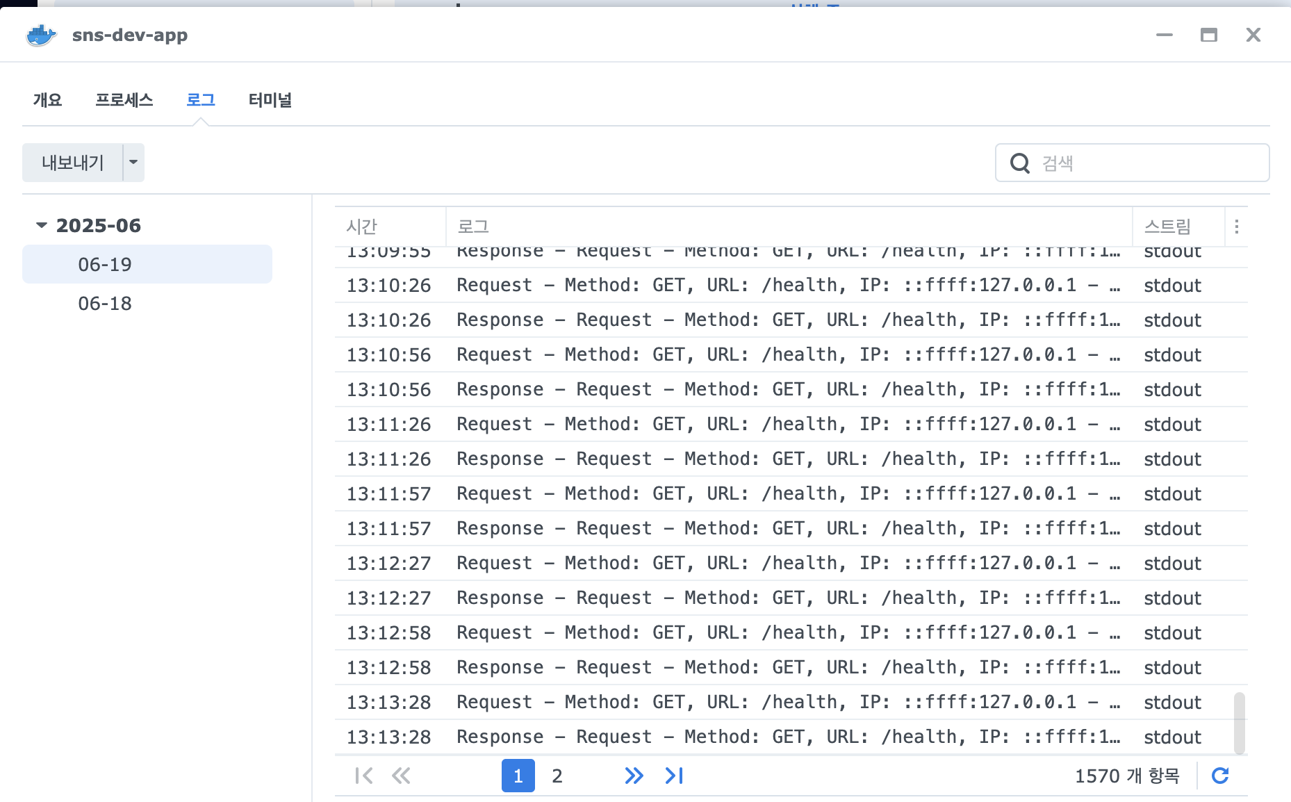 참고로 NAS의 Docker 컨테이너 내부에서도 동일하게 로그를 볼 수 있다.