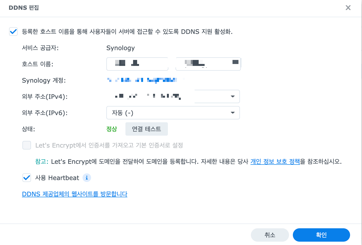 예를 들어 호스트 이름 앞이 test01이고, 서비스 공급자를 Synology로 선택하면 test01.synology.me 가 된다.