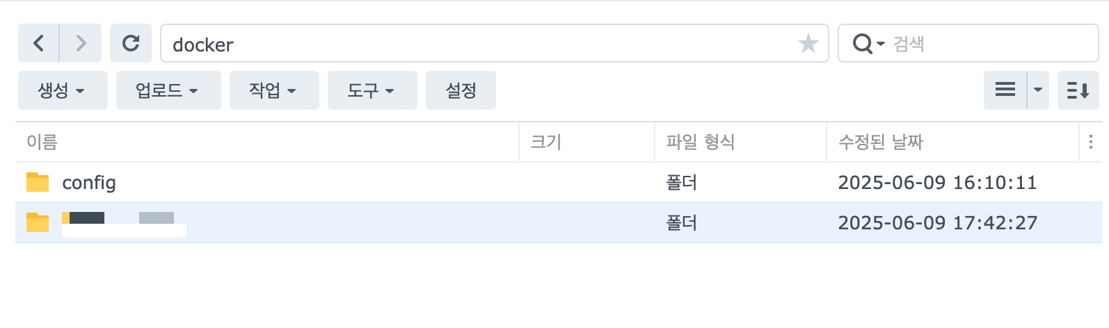 ssh로 나스에 접속한 후 위와 같은 명령어로 docker 폴더 내부로 진입한다.