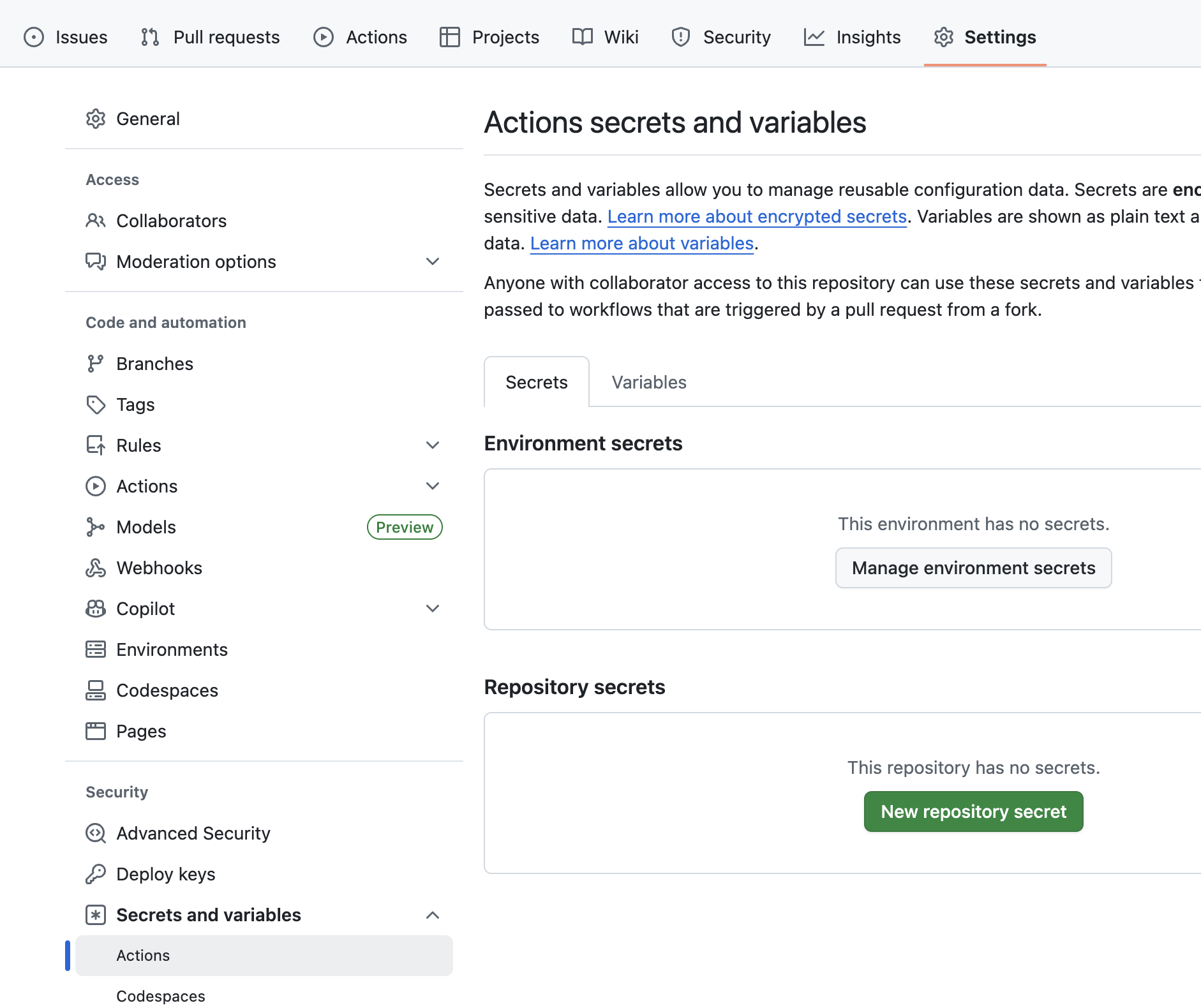 프로젝트의 Repository - Settings - Secrets and variables - Actions로 진입하여, Repository secrets에서 New repository secret 버튼을 누른다.