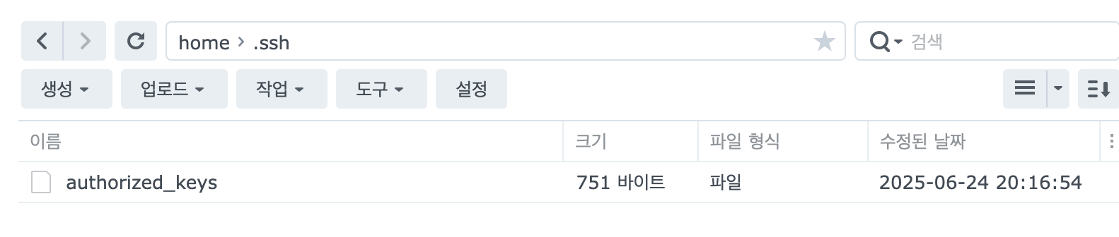NAS에 접속하여 위 명령어를 입력하면 id_rsa 값이 보일텐데 전부 복사하여 등록한다.