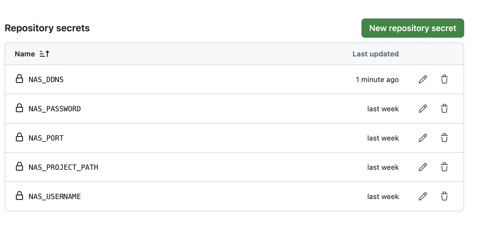 신기한 점은 Github Secrets으로 작성된 것들은, secrets.NAS_HOST 형식으로 접근이 가능하다는 점이다.