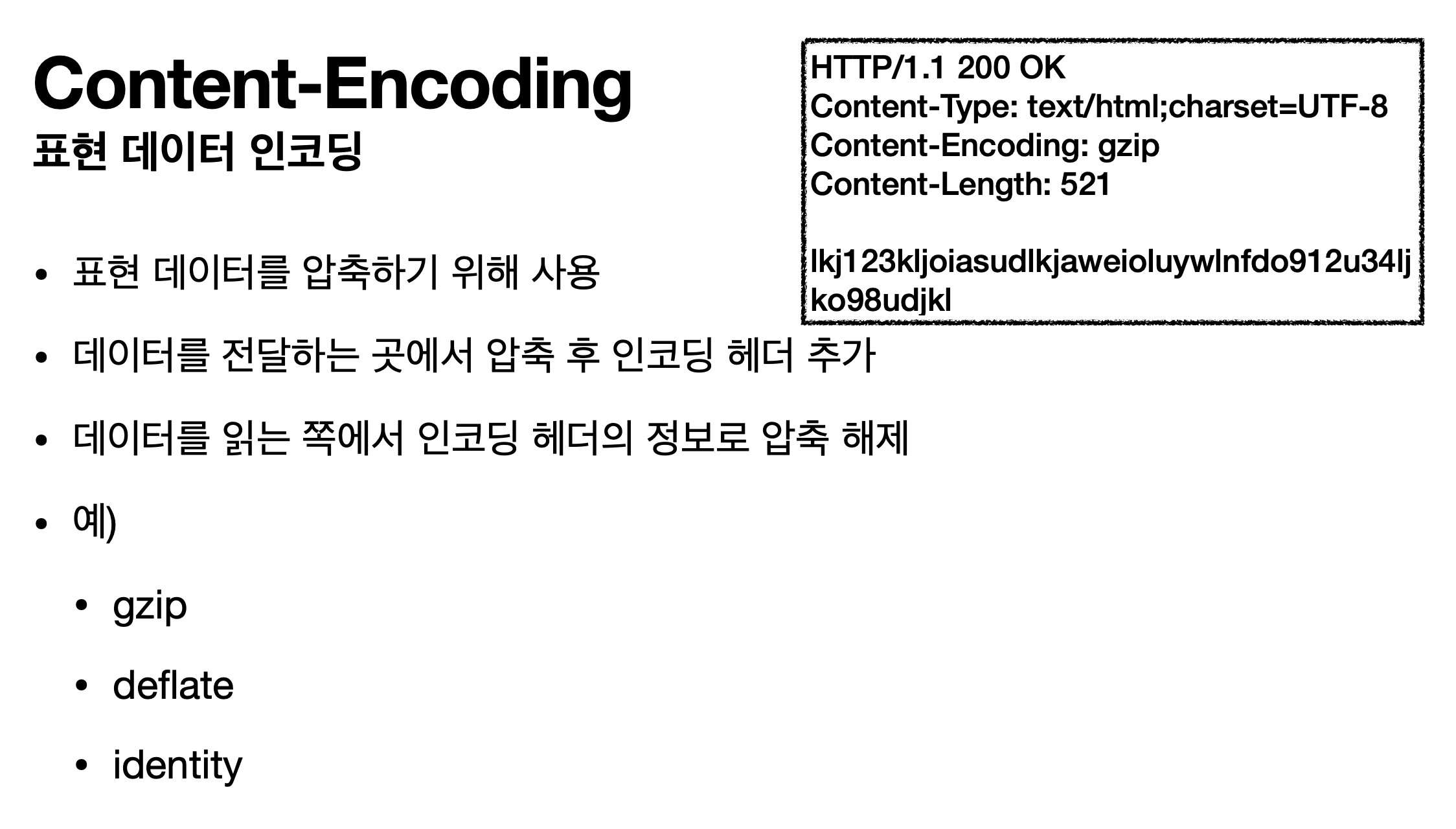 데이터를 압축을 어떤 압축을 하였는지를 포함한다. (클라이언트에서 무슨 압축으로 풀어야하는지 알아야하므로)