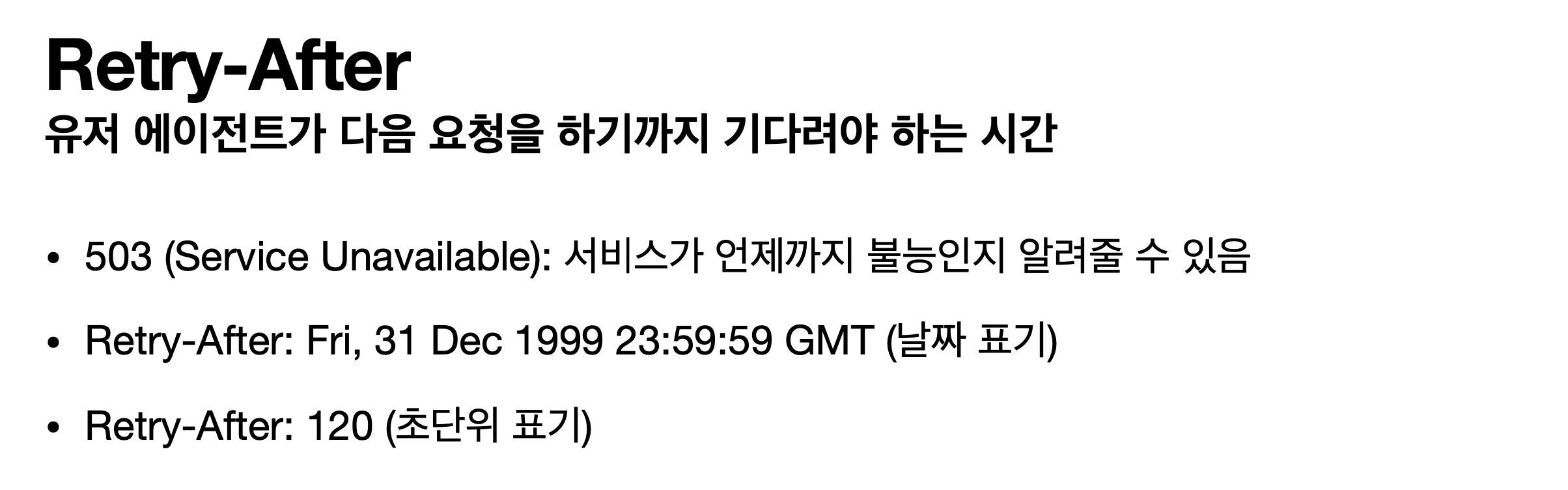- Retry-After : 유저 에이전트가 다음 요청을 하기까지 기다려야 하는 시간
