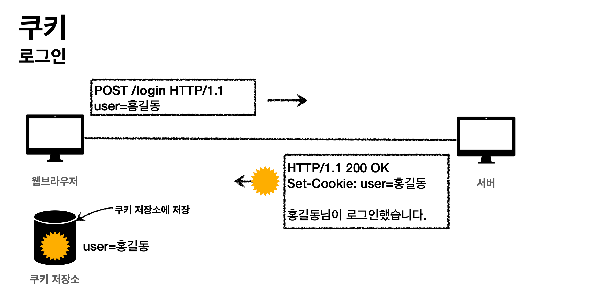 그렇다면 사용자가 로그인한 후 요청을 하게 되면 사용자가 로그인했다는 정보를 매번 어떻게 알 수 있을까? 그래서 해당 데이터를 보관하는 장소가 '쿠키'이다.