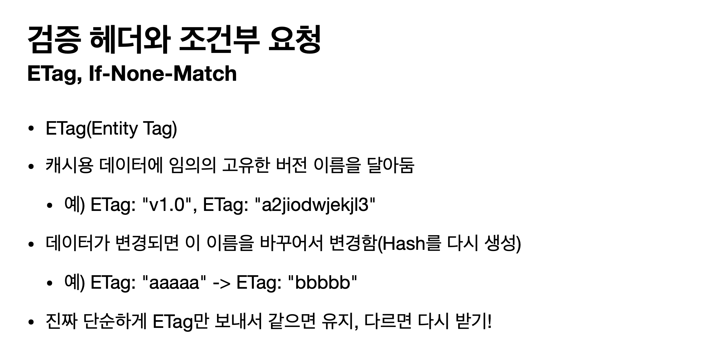 그리고 특히 이번 캐시에 대한 부분은 내가 기존에 포스팅한 S3에서 클라이언트 JSON 다운로드하는 부분에서 정말 고민해서 구축한 부분이 ETag 였는데 이렇게 HTTP 강의에서 보게되니 반갑기도 했다.