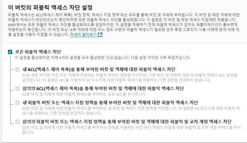 AWS S3 서비스에 접속하여 버킷을 만들 때 주의점은 '모든 퍼블릭 액세스 차단'이 체크되어 있어야 한다는 점이다. 우리는 앞서 AWS S3를 'private' 환경으로 만들것이라 하였는데, 이것이 그 부분에 해당된다.