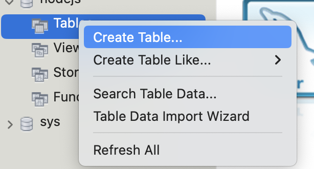 MySQL Workbench에서 nodejs 스키마의 Table항목에 오른쪽 마우스를 누르면 나오는 'Create Table...' 을 클릭한다.