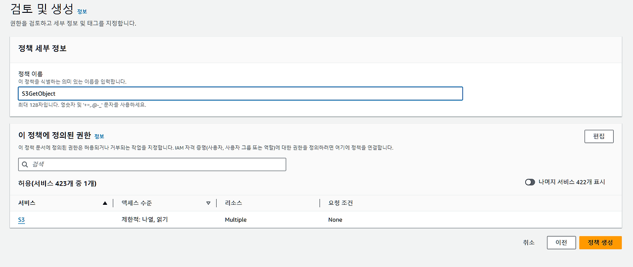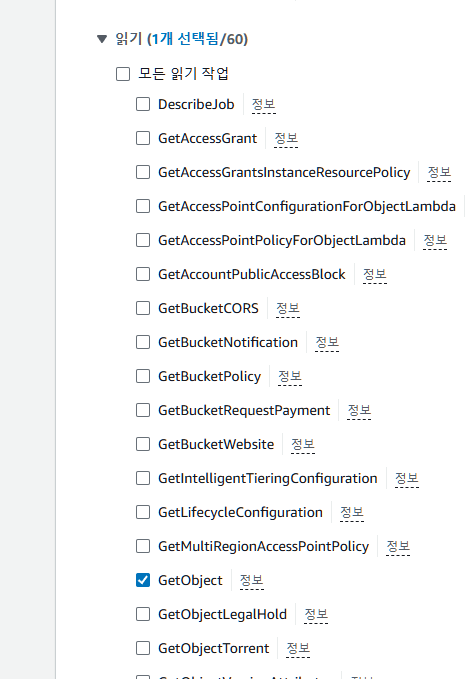 액세스 수준은 선택된 작업을 제외하곤 액세스 하지 않는다는 뜻이다. 'GetObject'는 우리가 S3에서 JSON 데이터를 가져오기 때문에 체크하도록 한다.
