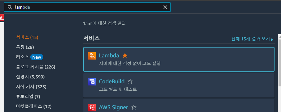 AWS에 접속하여 검색창에 Lambda를 찾고 Lambda 서비스로 이동한다.